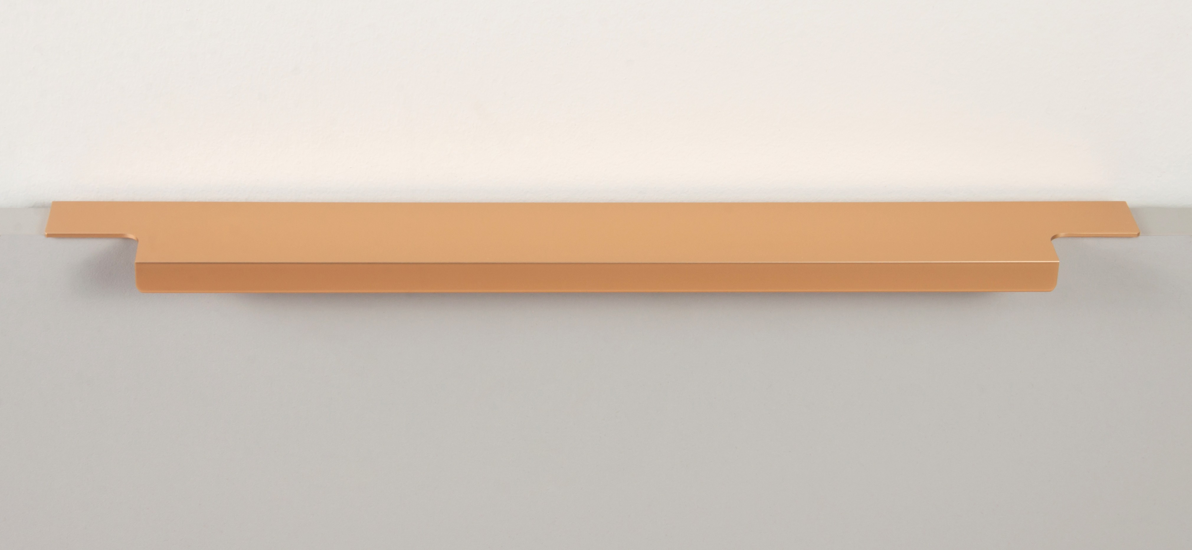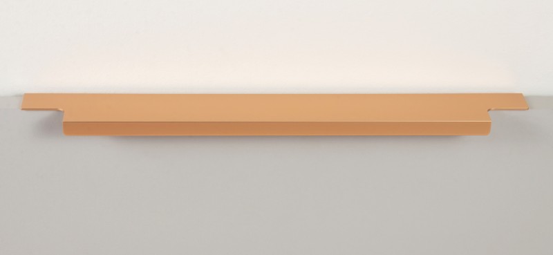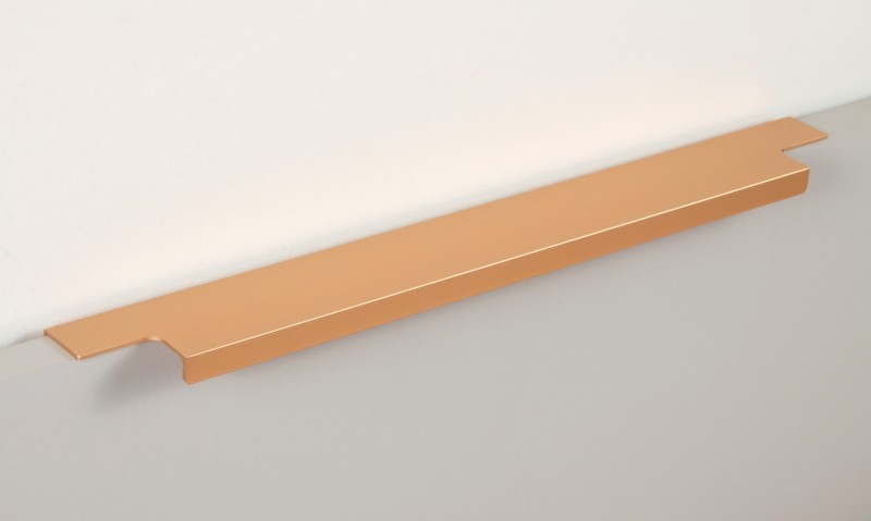 Ручка имеет богатую палитру цветовых решений и разнообразие длин. В зависимости от длины, модель допускает размещение двумя способами — «в размер» фасада и по центру широких фасадов (как большой «язычок»).