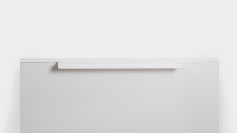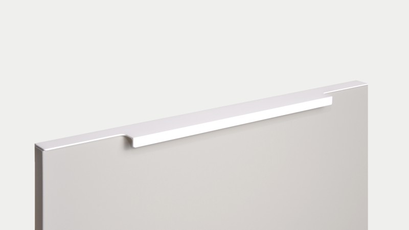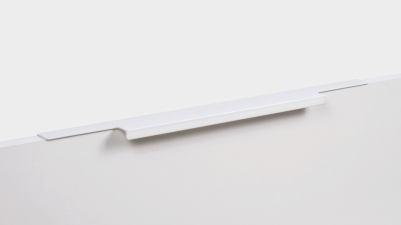 Ручка имеет богатую палитру цветовых решений и разнообразие длин. В зависимости от длины, модель допускает размещение двумя способами — «в размер» фасада и по центру широких фасадов (как большой «язычок»).