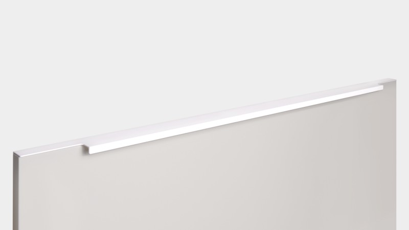 Ручка имеет богатую палитру цветовых решений и разнообразие длин. В зависимости от длины, модель допускает размещение двумя способами — «в размер» фасада и по центру широких фасадов (как большой «язычок»).
