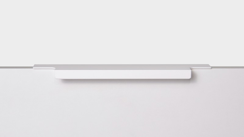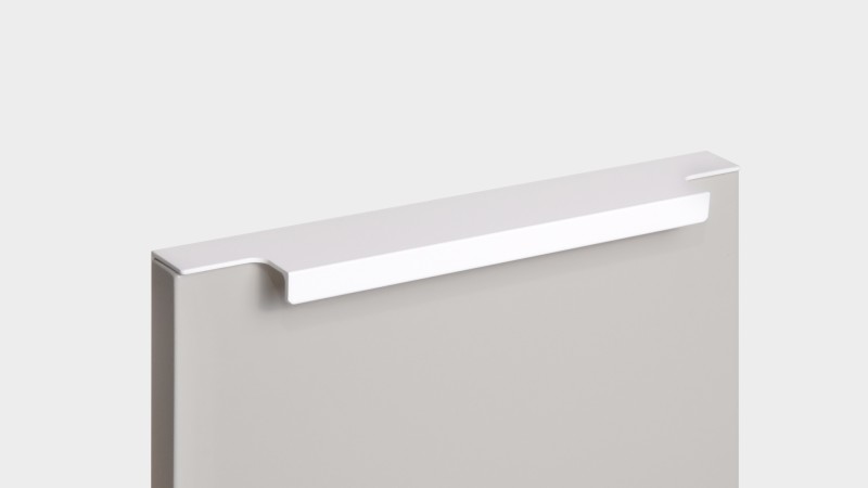 Ручка имеет богатую палитру цветовых решений и разнообразие длин. В зависимости от длины, модель допускает размещение двумя способами — «в размер» фасада и по центру широких фасадов (как большой «язычок»).