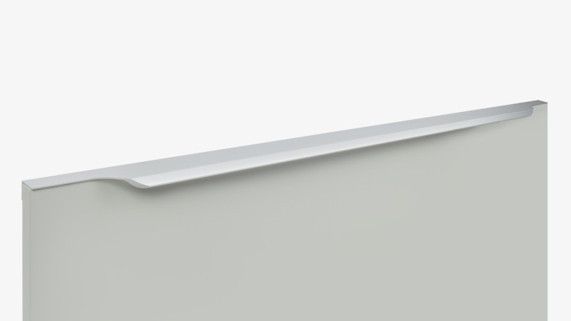 TERA подойдёт как для узких бутылочниц и корзин-карго, так и ящиков формата макси. Торцевую ручку, независимо от размера, можно устанавливать не только чётко в размер фасада, но и как широкий язычок. Ручки в виде язычков прекрасно выполняют свою функциональную и эстетическую роль на более широких фасадах.