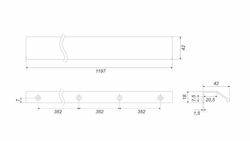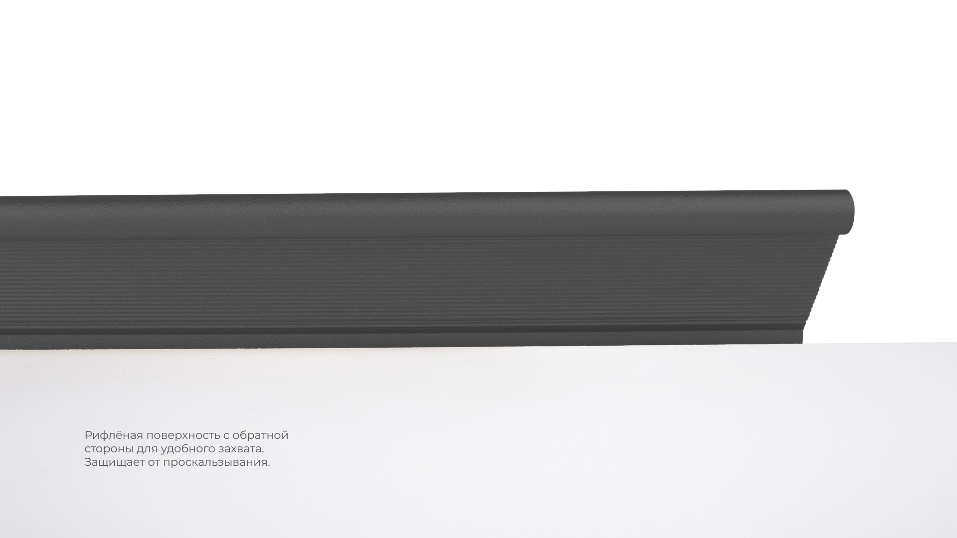 METRICA RT112 — торцевая ручка из алюминия, с геометричным выступом и рифлением в зоне захвата для эргономичного использования. Устанавливается наложением, подходит для фасадов толщиной от 16 мм до 20 мм.