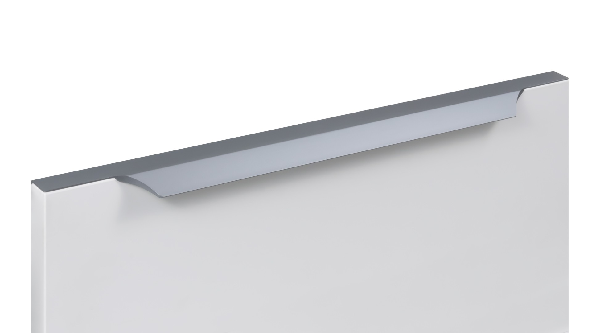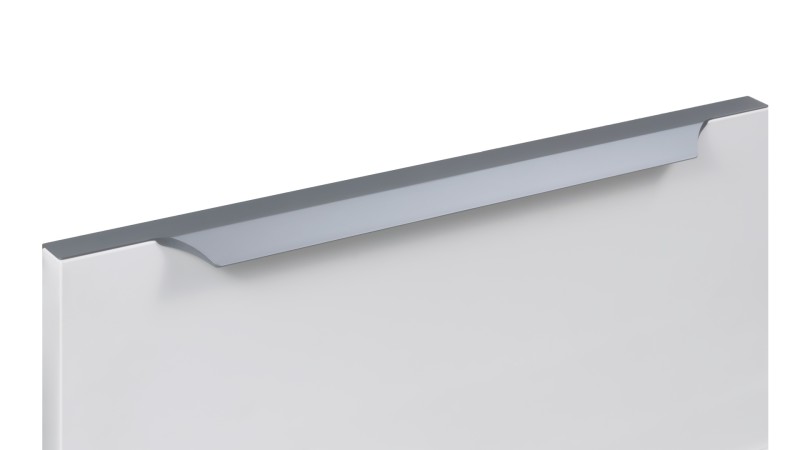 WING RT114 — торцевая ручка с изгибом из алюминия, устанавливается наложением на фасады толщиной 18,8 мм (в цветах BL,GR,SC,SG) и 18,5 мм (в цвете W).