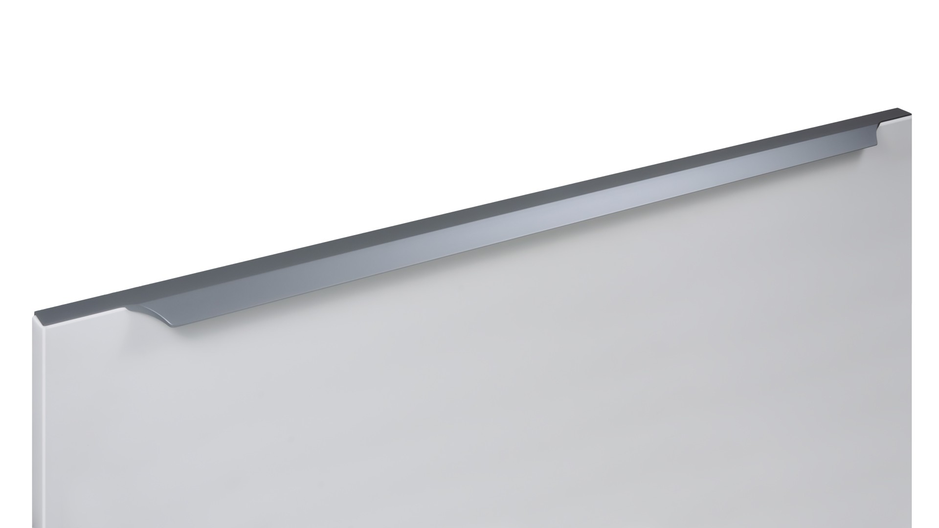 WING RT114 — торцевая ручка с изгибом из алюминия, устанавливается наложением на фасады толщиной 18,8 мм (в цветах BL,GR,SC,SG) и 18,5 мм (в цвете W).
