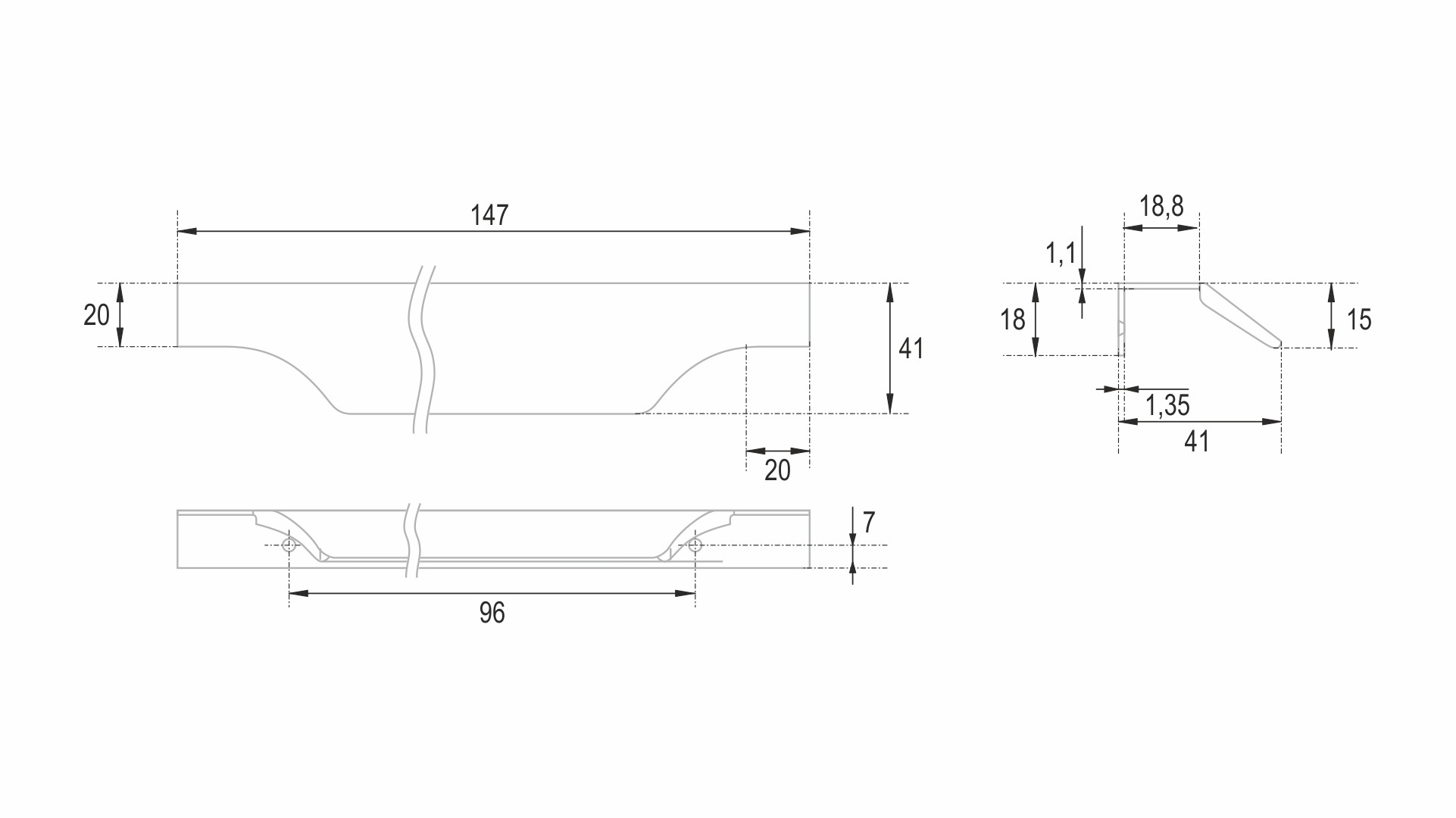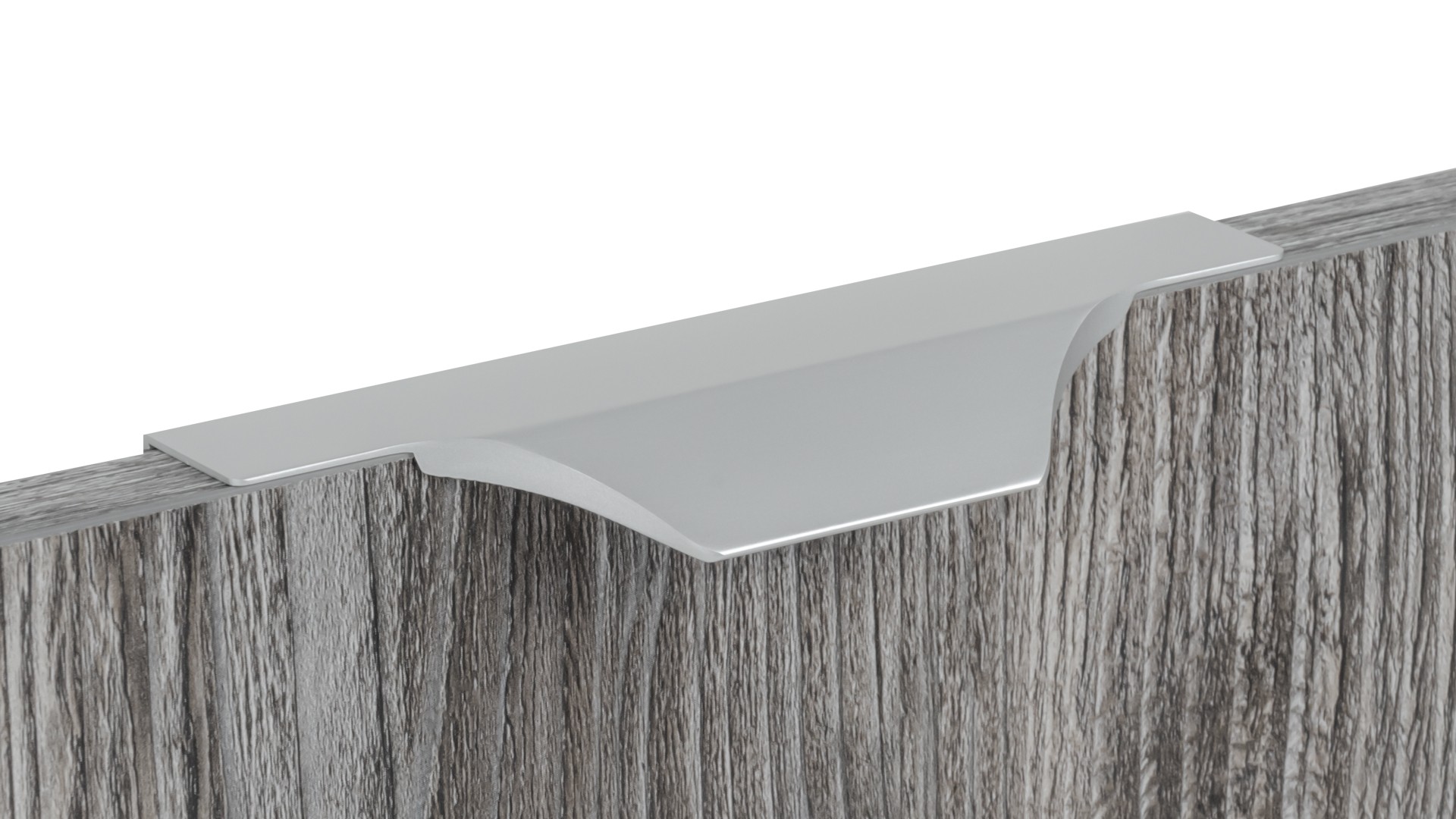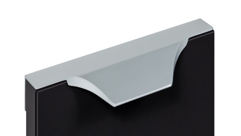 WING RT114 — торцевая ручка с изгибом из алюминия, устанавливается наложением на фасады толщиной 18,8 мм (в цветах BL,GR,SC,SG) и 18,5 мм (в цвете W).
