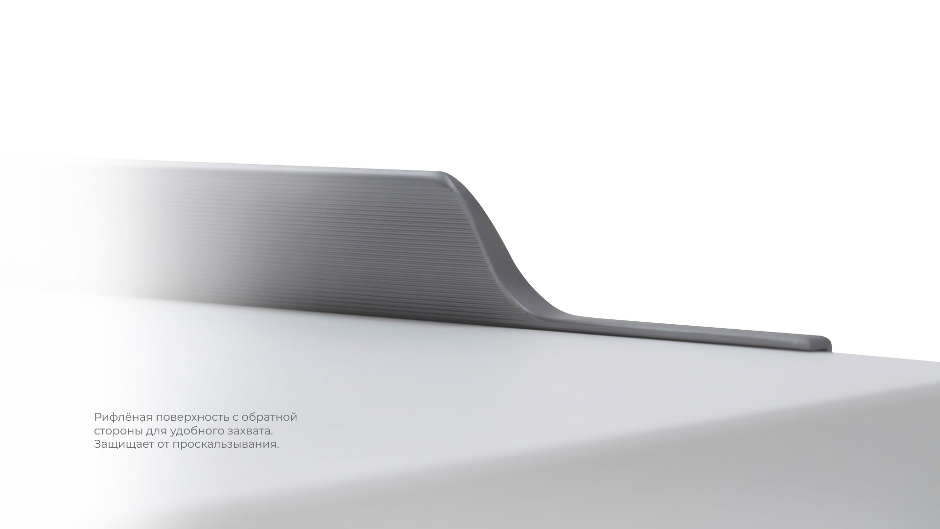 Конструкция ручки имеет детально проработанный выступ по всей длине, что создаёт эффект погружения фасада, аккуратно закрывая его края. Рифлёное покрытие в зоне захвата обеспечит эргономичное использование ручки без соскальзывания.
