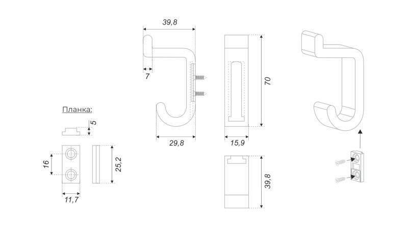 1 крючок в полиэтиленовой упаковке, 2 самореза 4*18, крепёжная планка, фиксирующий винт