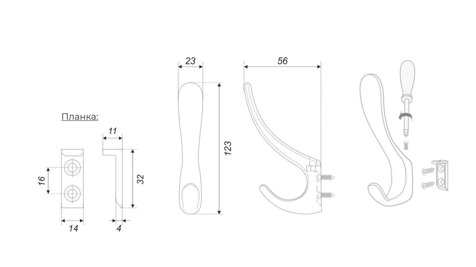 В комплект входит: крючок, крепёжная планка, саморезы 4х18 (2 шт.), крепёжный винт (1 шт.). Рекомендуемая установка на плиту толщиной 16 мм.