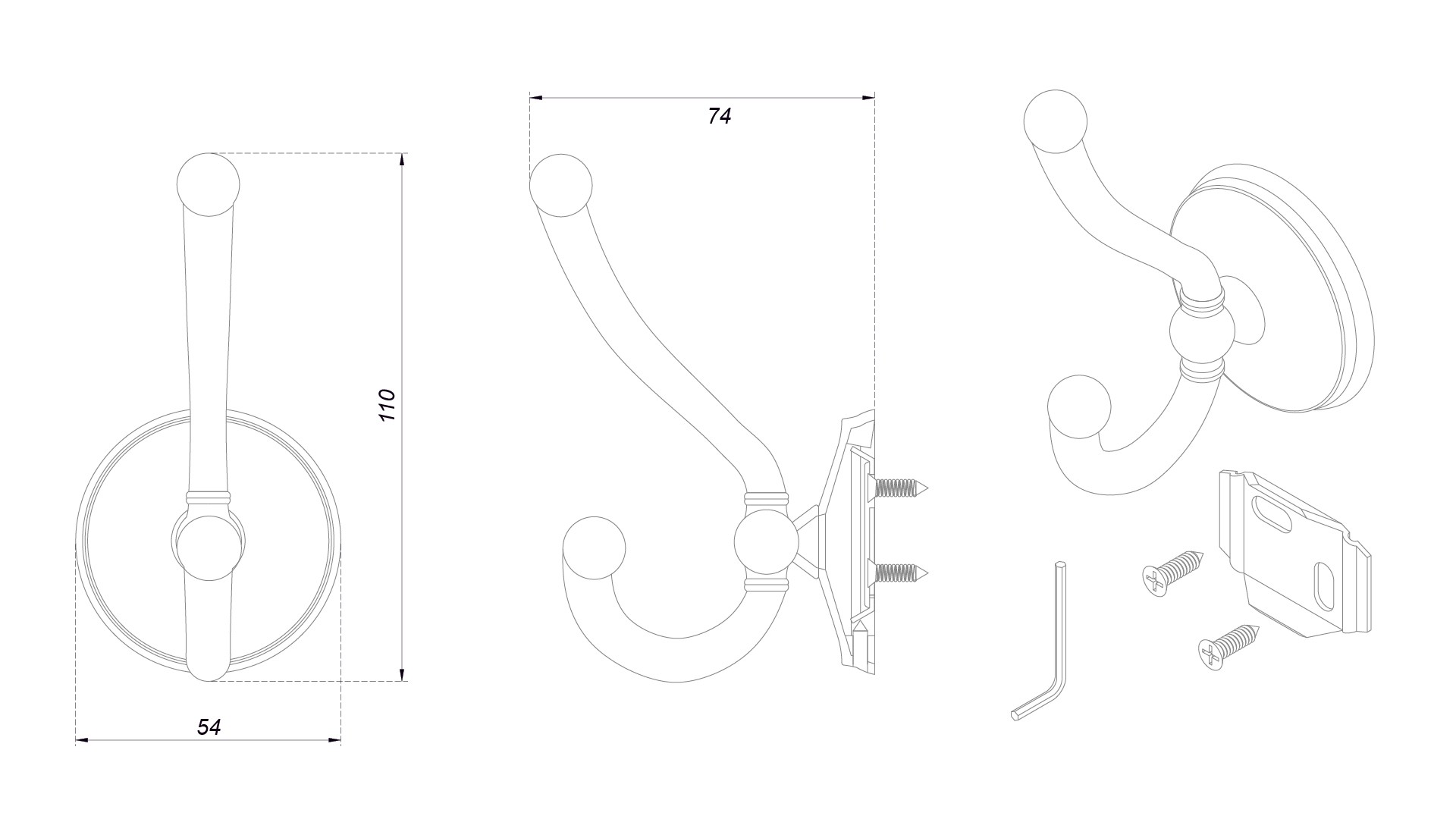 1 крючок в полиэтиленовой упаковке, 2 самореза 4*18, крепёжная планка, фиксирующий винт