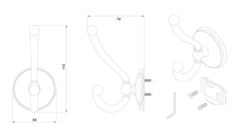 1 крючок в полиэтиленовой упаковке, 2 самореза 4*18, крепёжная планка, фиксирующий винт