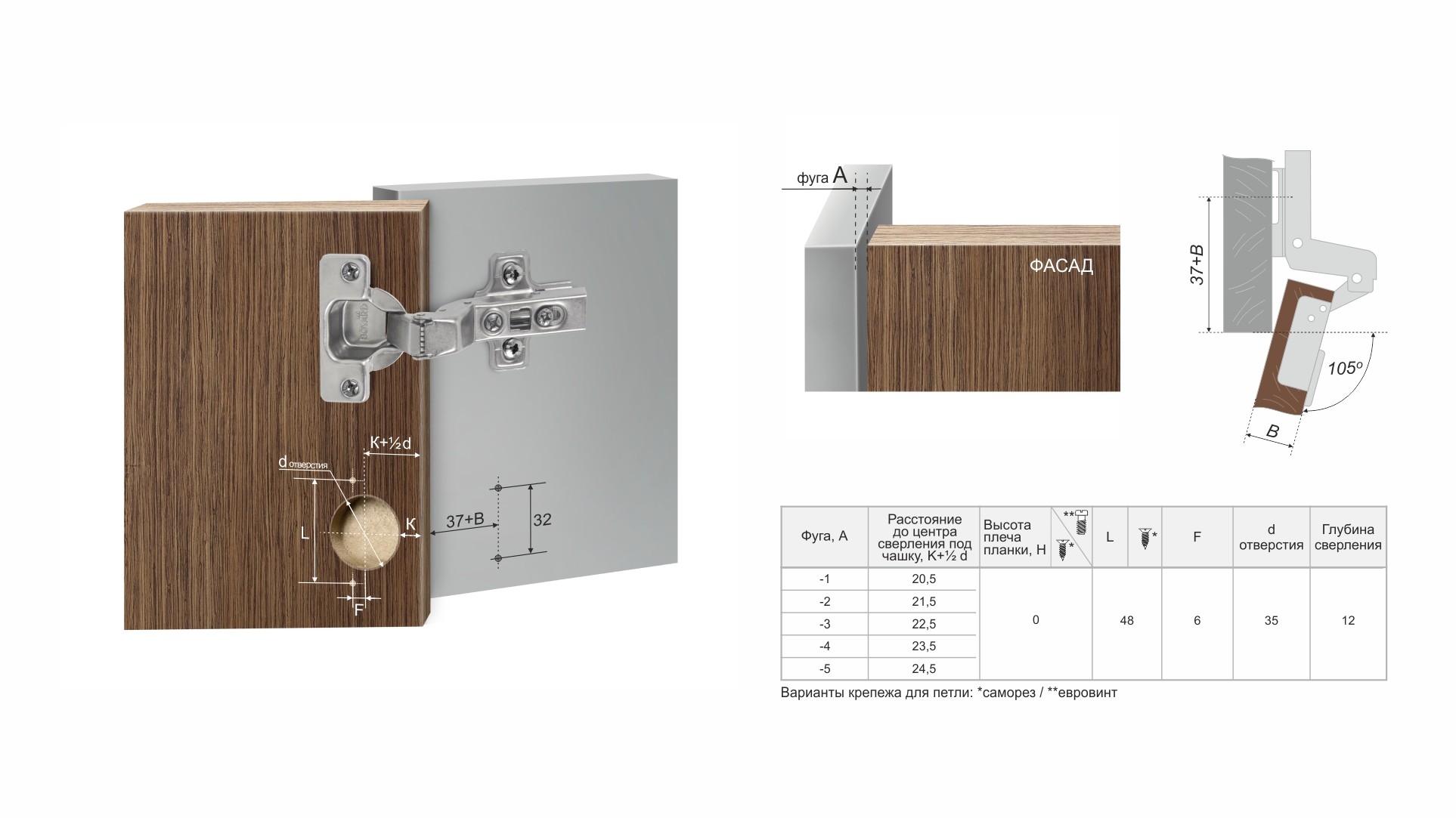 Н301 — одноходовая мебельная петля с амортизатором и углом установки 90°. Обеспечит плавное и мягкое открывание/закрывание фасада одним движением.
