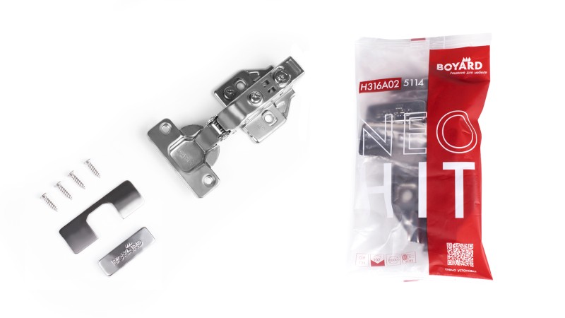 НЕО ХИТ H316 - удобный комплект, состоящий из качественной базовой петли с эксцентриковым винтом и монтажом Клип-он, ответной планки, крепежа и заглушки на чашку и корпус петли – в удобной фирменной упаковке, для фасадов толщиной 16-22 мм.