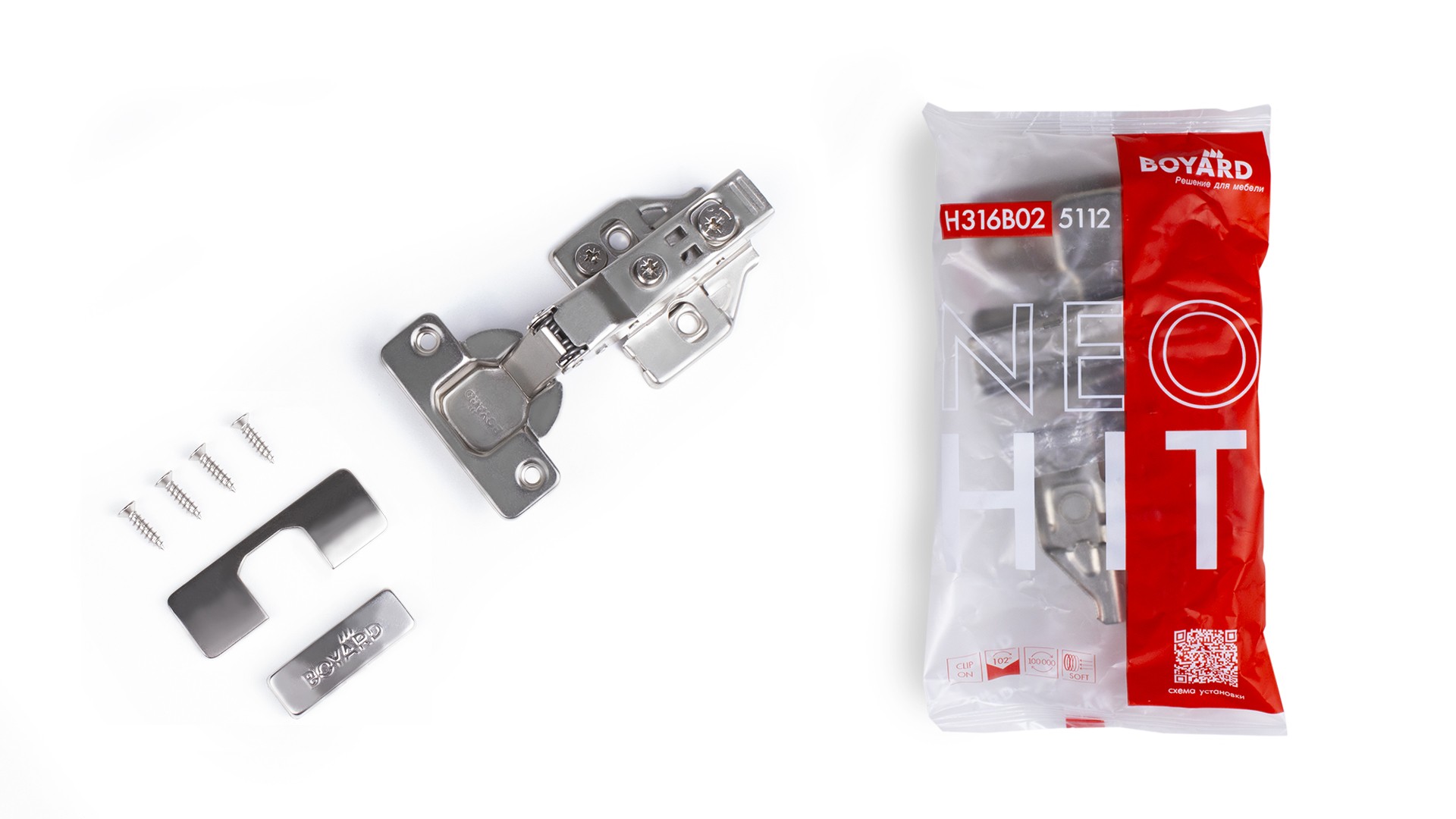 NEO HIT H316 - удобный комплект, состоящий из качественной базовой петли с эксцентриковым винтом и монтажом Clip-on, ответной планки, крепежа и заглушки на чашку и корпус петли – в фирменной упаковке.