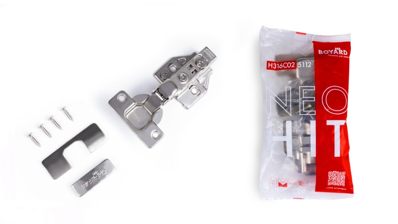 НЕО ХИТ H316 - удобный комплект, состоящий из качественной базовой петли с эксцентриковым винтом и монтажом Клип-он, ответной планки, крепежа и заглушки на чашку и корпус петли – в фирменной упаковке, для фасадов толщиной 16-22 мм.
