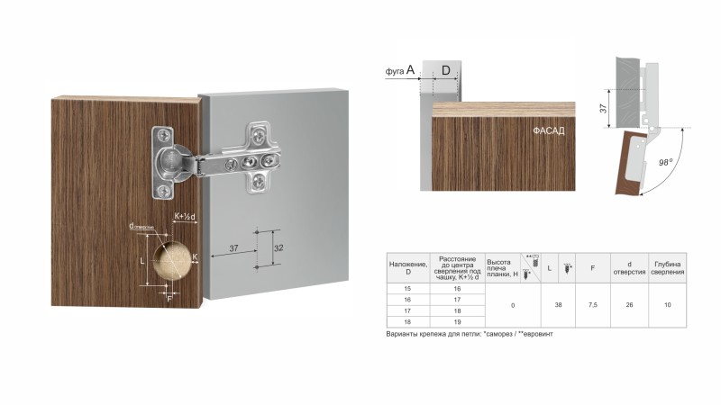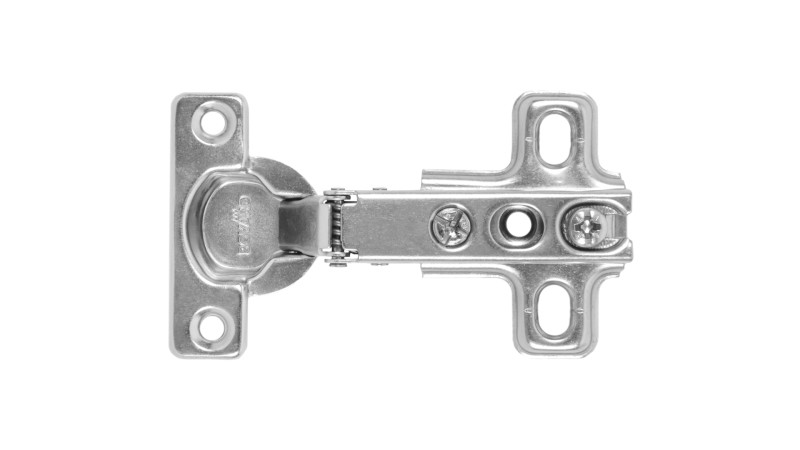 H402 — одноходовая мебельная mini-петля без амортизатора, с углом установки 90°. Предназначена для надежного крепления накладных, полунакладных и вкладных фасадов из плитных материалов.