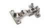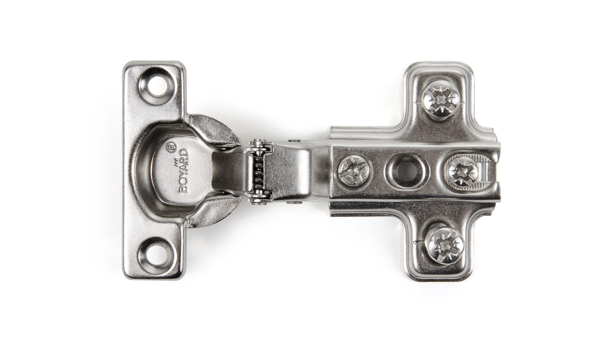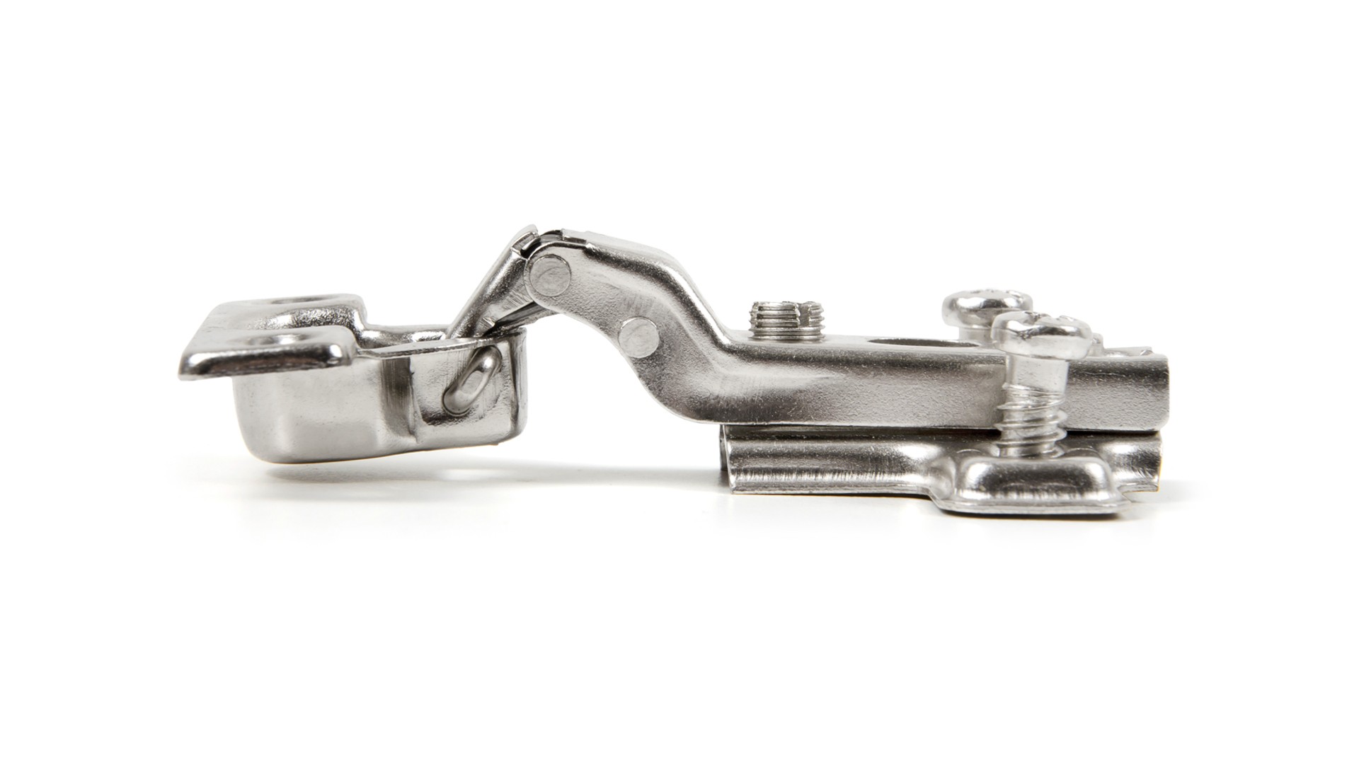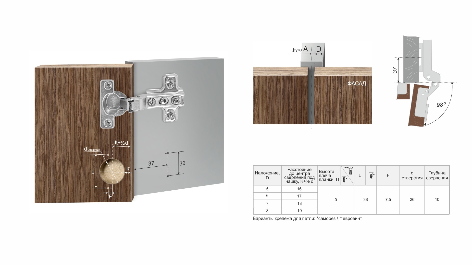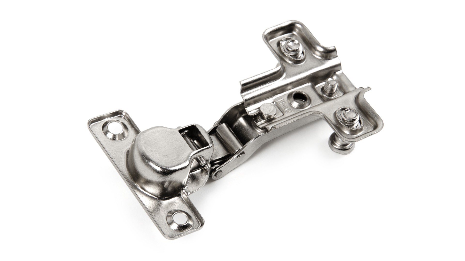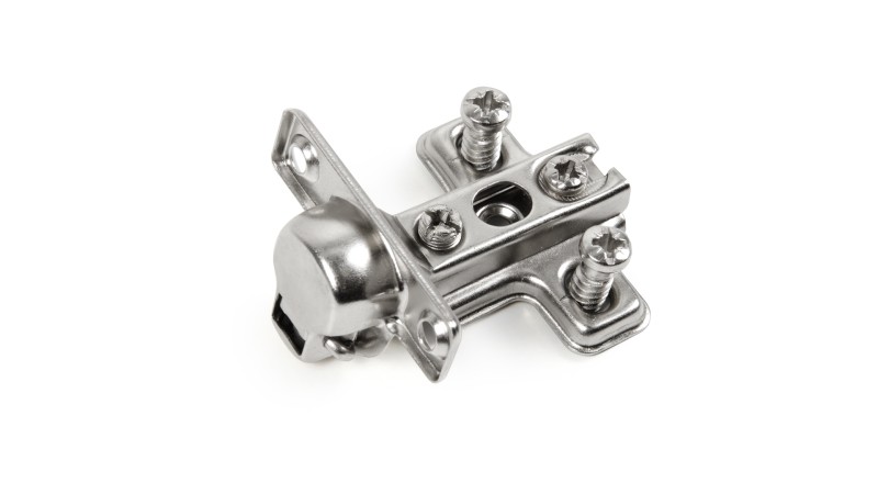 H402 — мебельная мини-петля без амортизатора, с углом установки 90° с планкой с вкрученными евровинтами. Предназначена для надежного крепления фасадов из плитных материалов.