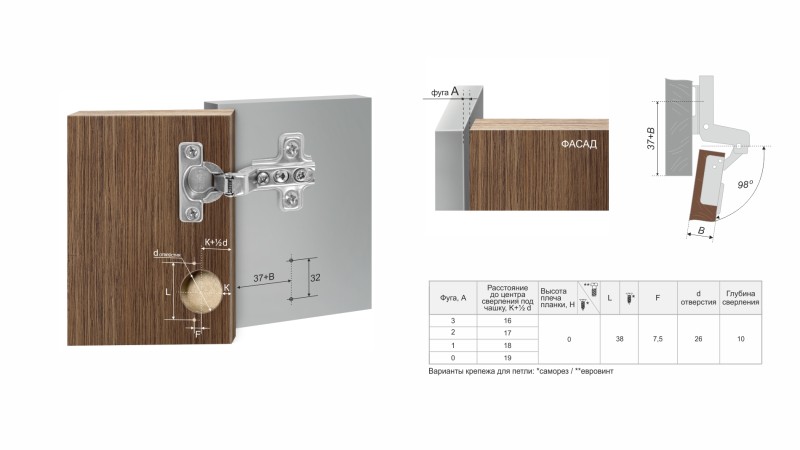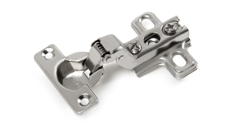 H402 — одноходовая мебельная МИНИ-петля без амортизатора, с углом установки 90°. Предназначена для надежного крепления накладных, полунакладных и вкладных фасадов из плитных материалов.