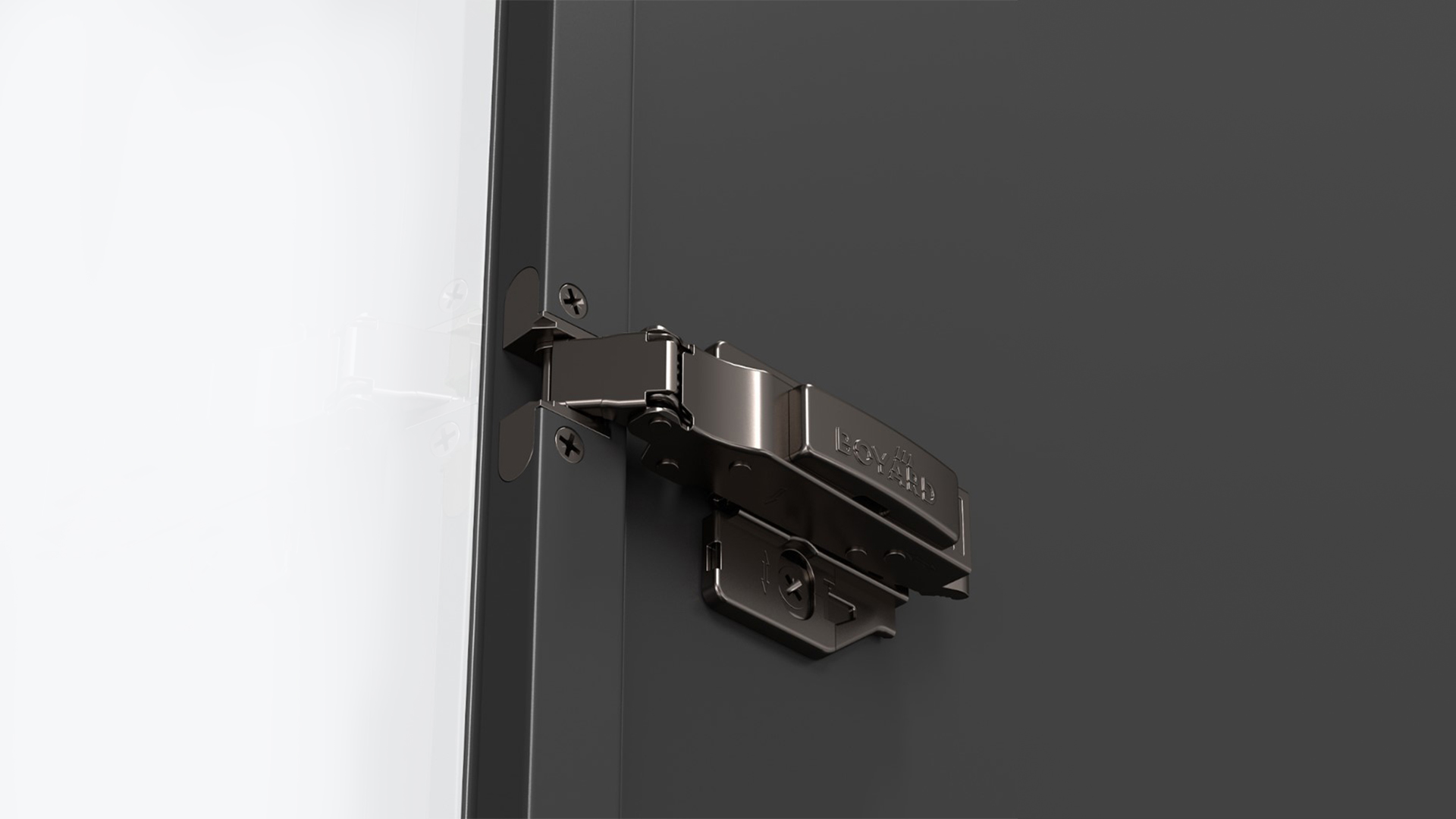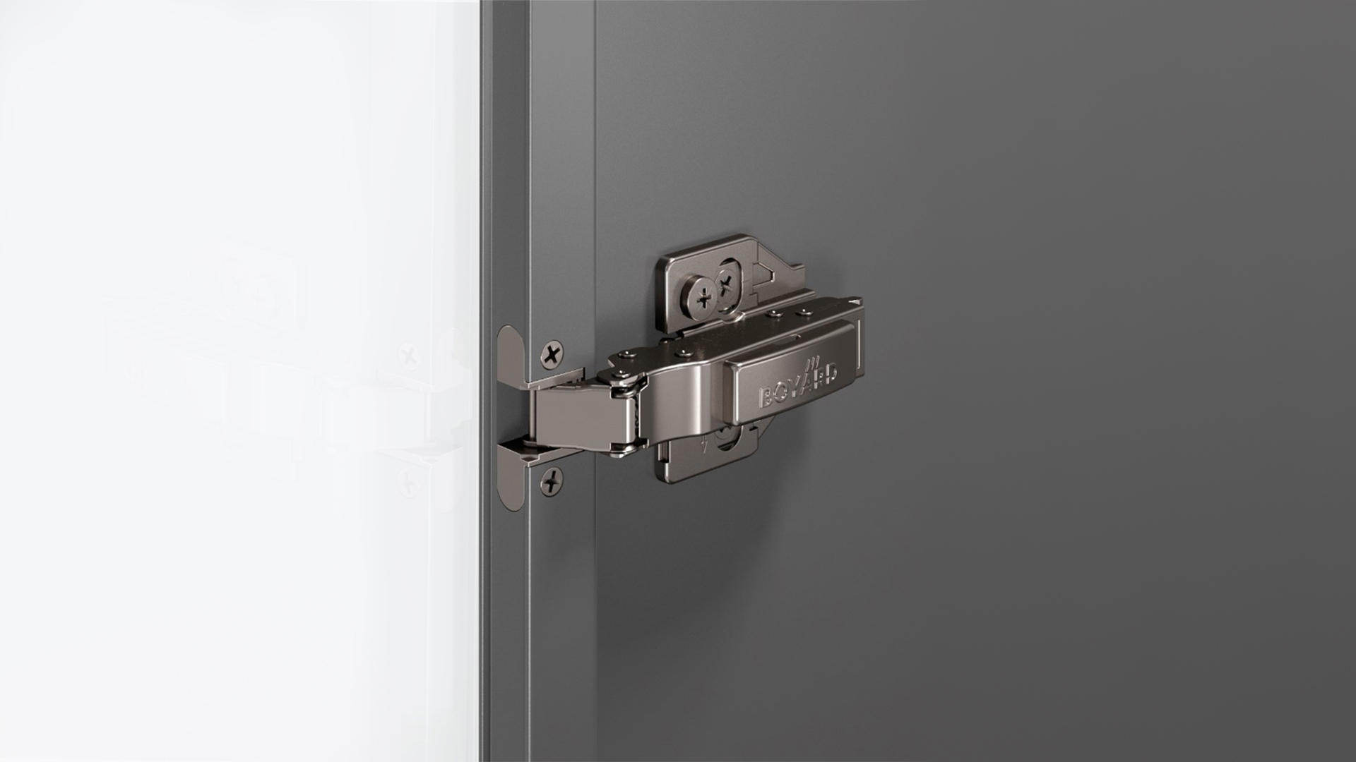РАМКА H813 — накладная петля линейки ЭVO с амортизацией и 3D-регулировкой для трендовых рамочных фасадов из узкого алюминиевого профиля.