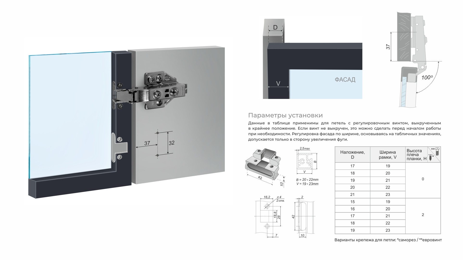 В «чашку» Н813 предустановлены винты специальной формы с увеличенной площадью контакта с профилем. За счет этого возможно использование петли с узким профилем от 1 мм.