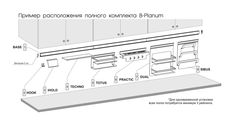 Серия современных навесных кухонных аксессуаров B-Planum выполнена из алюминия в наиболее надёжном покрытии методом анодирования. Технологией покрытия и разные способы производства полок и базы рейлинга, обусловлен возможный малозаметный разнотон в оттенке покрытия полок и базы рейлинга, не влияющий на внешний вид изделий и дизайн мебели в целом.