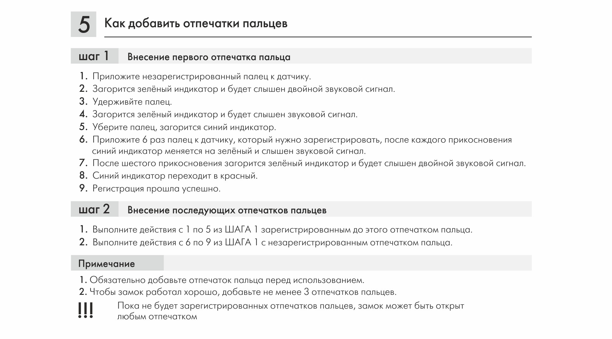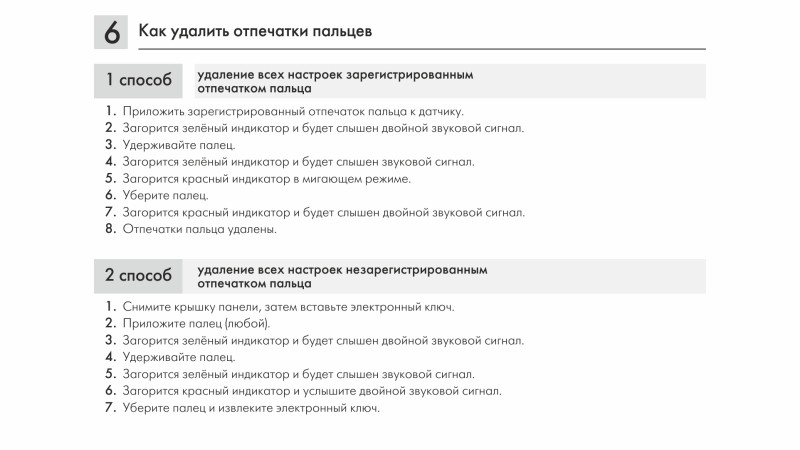 Модель обладает высокочувствительным быстро реагирующим биометрическим датчиком. К замку можно настроить до 20 отпечатков пальцев. До момента настройки замок может открыть любой отпечаток.