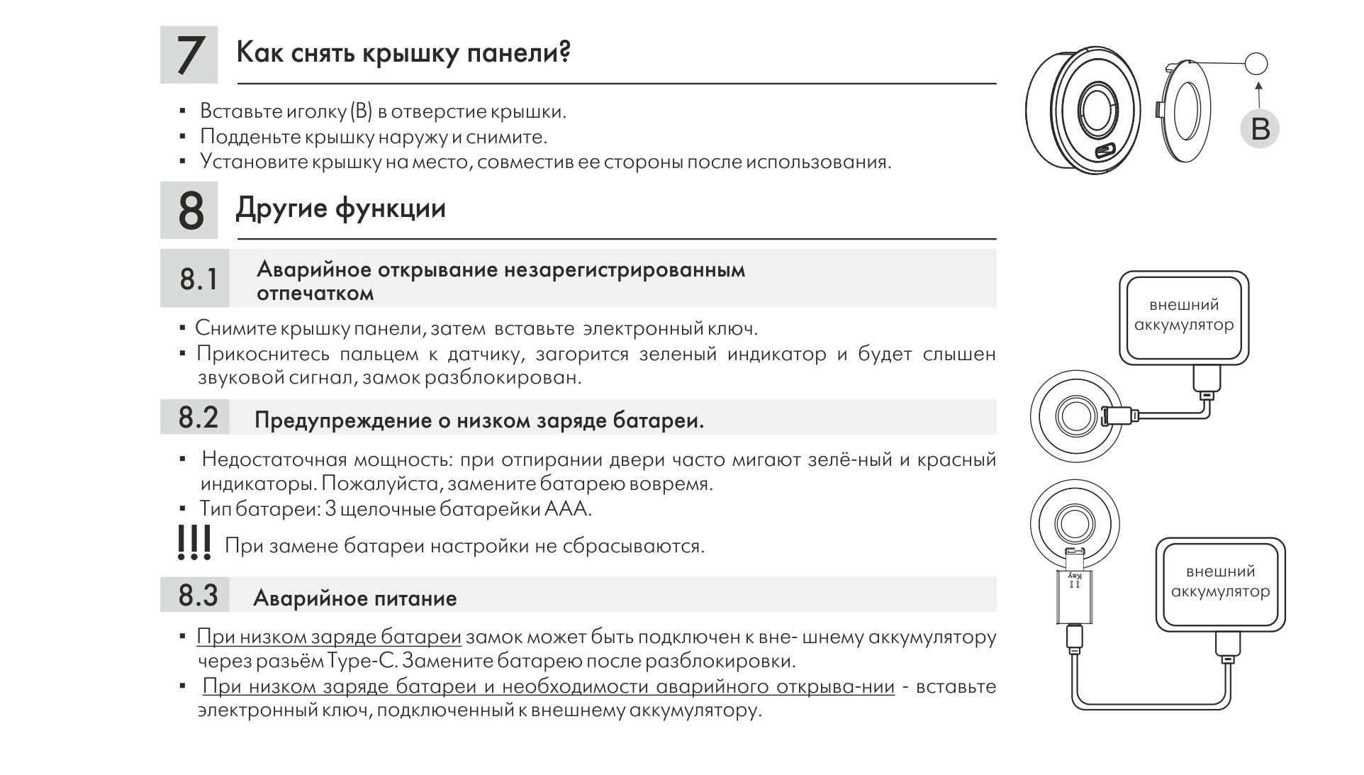 Если ранее настроенные к замку отпечатки утрачены, замок может быть открыт с помощью электронного ключа через разъем Type-C.