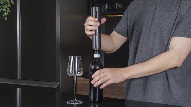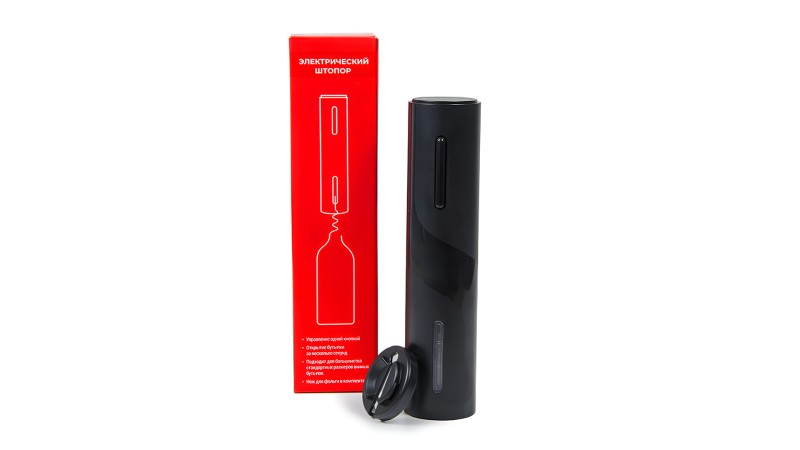 В первую очередь снимите фольгу с горлышка бутылки, срезав ее специальным ножиком, который идет в комплекте. Затем поместите штопор вертикально над горлышком и нажмите нижнюю кнопку на штопоре, чтобы откупорить бутылку. Нажмите верхнюю кнопку чтобы обратным движением спирали достать пробку из штопора.