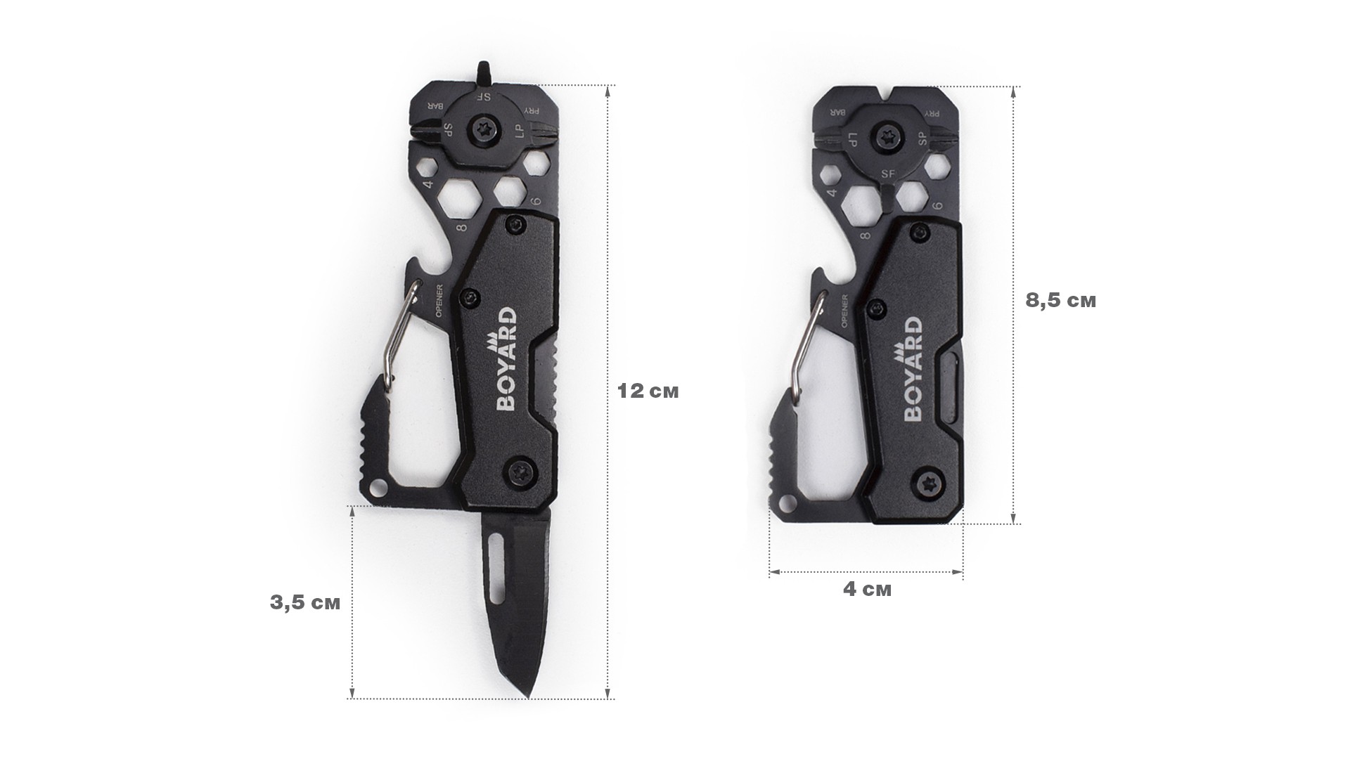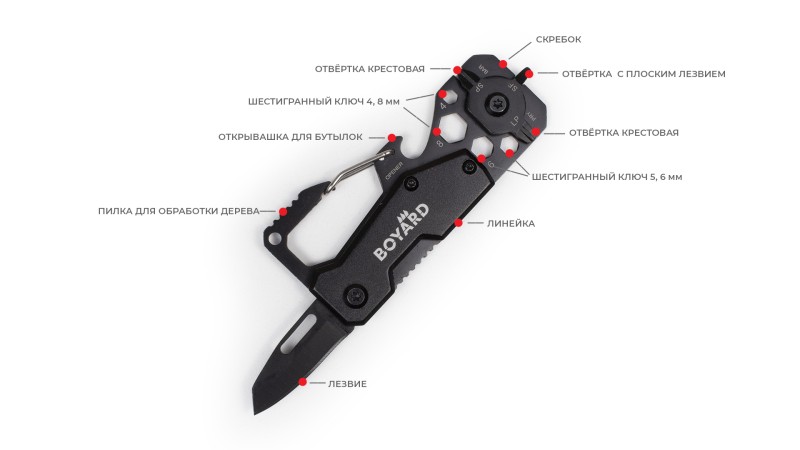 Карманный мультитул BOYARD – полезный аксессуар, который пригодится на рабочем месте, во время отдыха или путешествия, его удобно хранить в кармане, в машине и даже в дамской сумочке. Его возможности, удобные габариты, универсальность и простота в использовании делают мультитул BOYARD актуальным презентом коллегам и партнёрам по любому поводу.