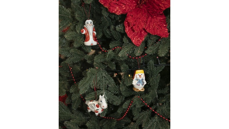 Набор эксклюзивных ёлочных керамических игрушек, расписанных вручную, - это особый элемент декора, символизирующий семейные традиции и новогоднее волшебство. Ручная роспись в жанре народного творчества делает каждую игрушку оригинальной и неповторимой. В набор входит 3 игрушки в виде традиционных и легко узнаваемых сказочных персонажей: Дед Мороз (высота 80 мм), Снеговик (высота 70 мм) и Лошадка - символ 2026 года (высота 75 мм) и подвесные нити для них.