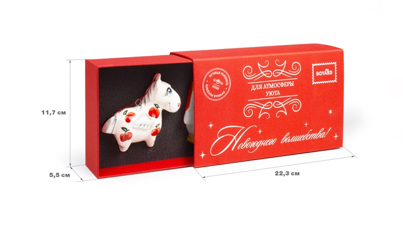 Игрушки упакованы в презентабельную брендированную подарочную коробку-пенал с ложементом, обеспечивающую безопасность сувениров при транспортировке и долговременном хранении.