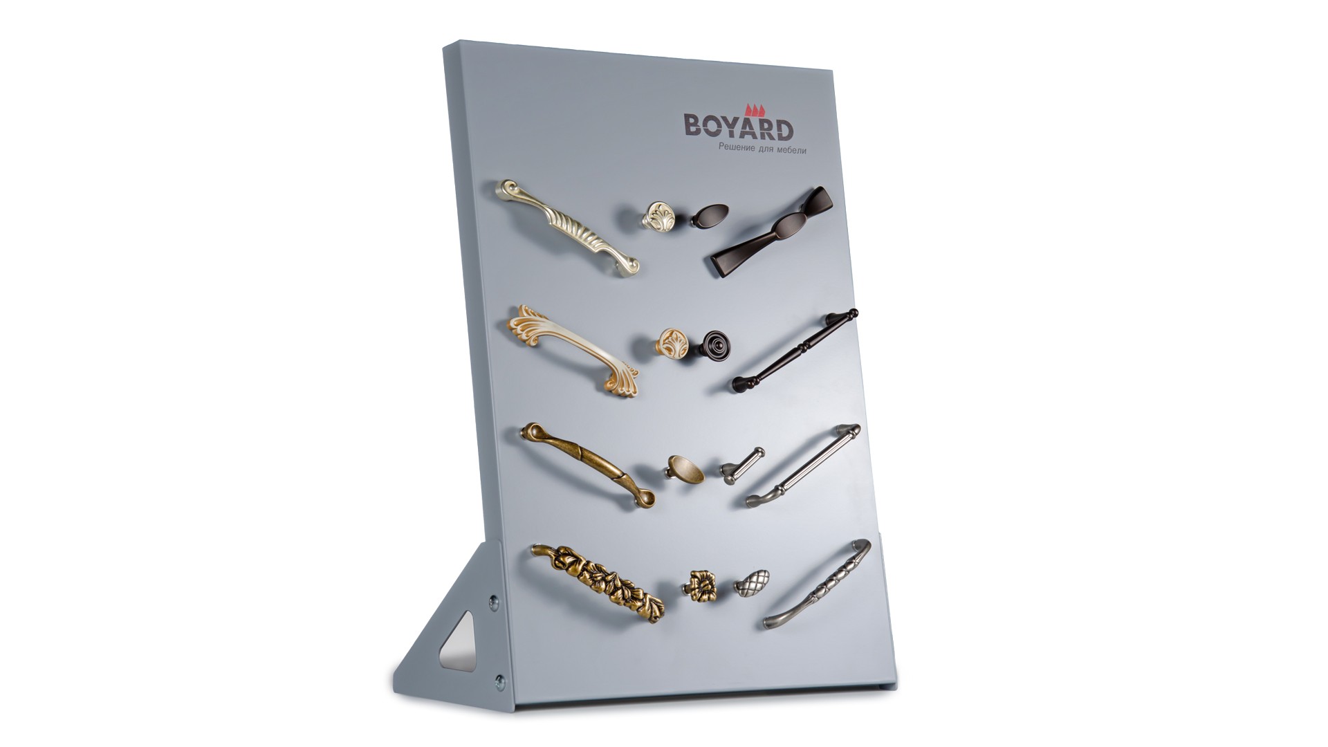 Металлический демонстрационный планшет S902 — планшет для демонстрации мебельных ручек BOYARD в шоурумах, мебельных салонах. Продукция крепится на планшет с помощью магнитов. Благодаря этому очень легко и быстро можно менять экспозиции и примерять модели на фасады, что упрощает процесс выбора лицевой фурнитуры для мебельных проектов.