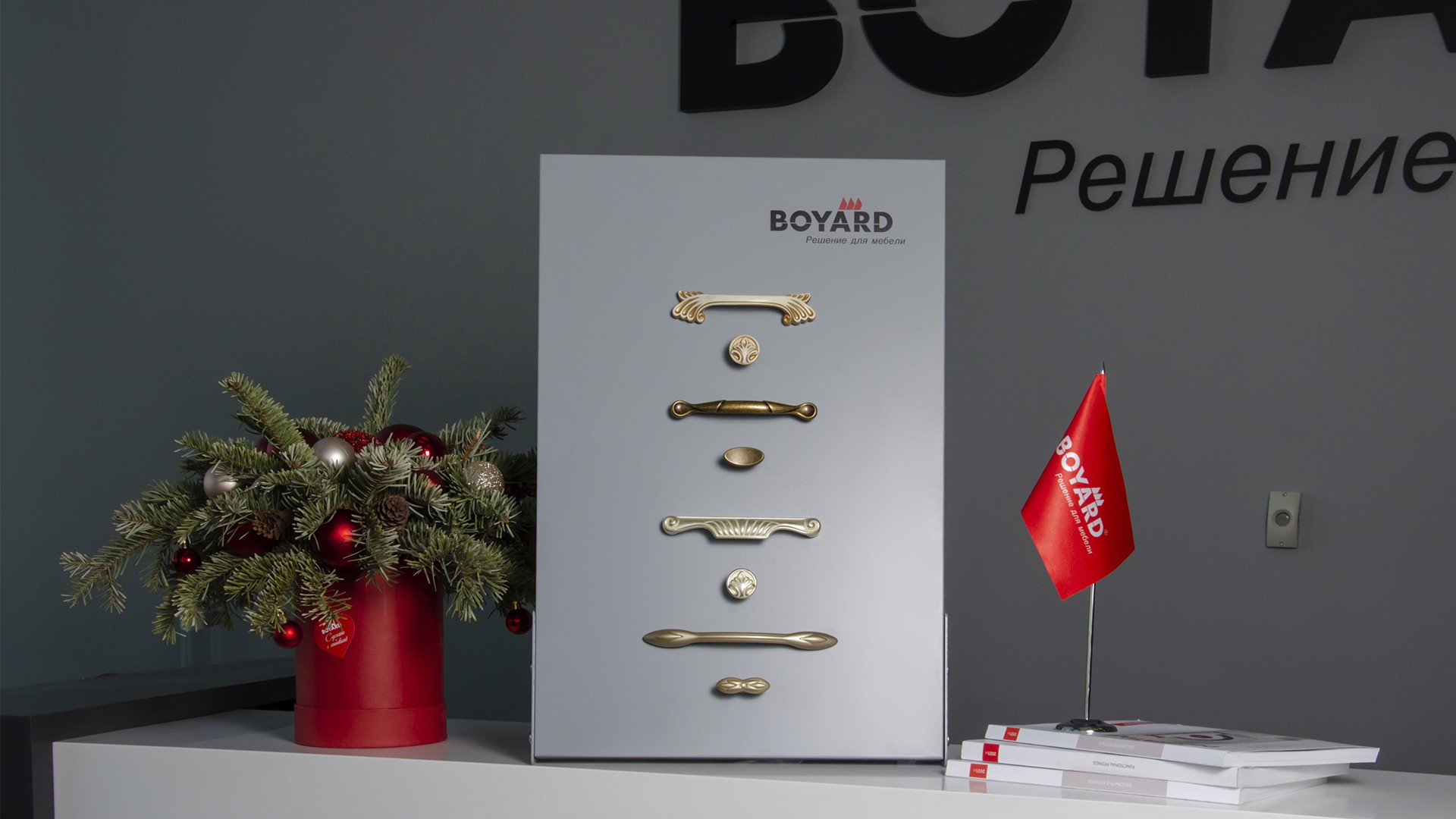 В комплект входит: брендированный планшет размером 400х600 мм с опорами и крепежом для установки, 50 магнитов и 50 винтов для установки изделий.
