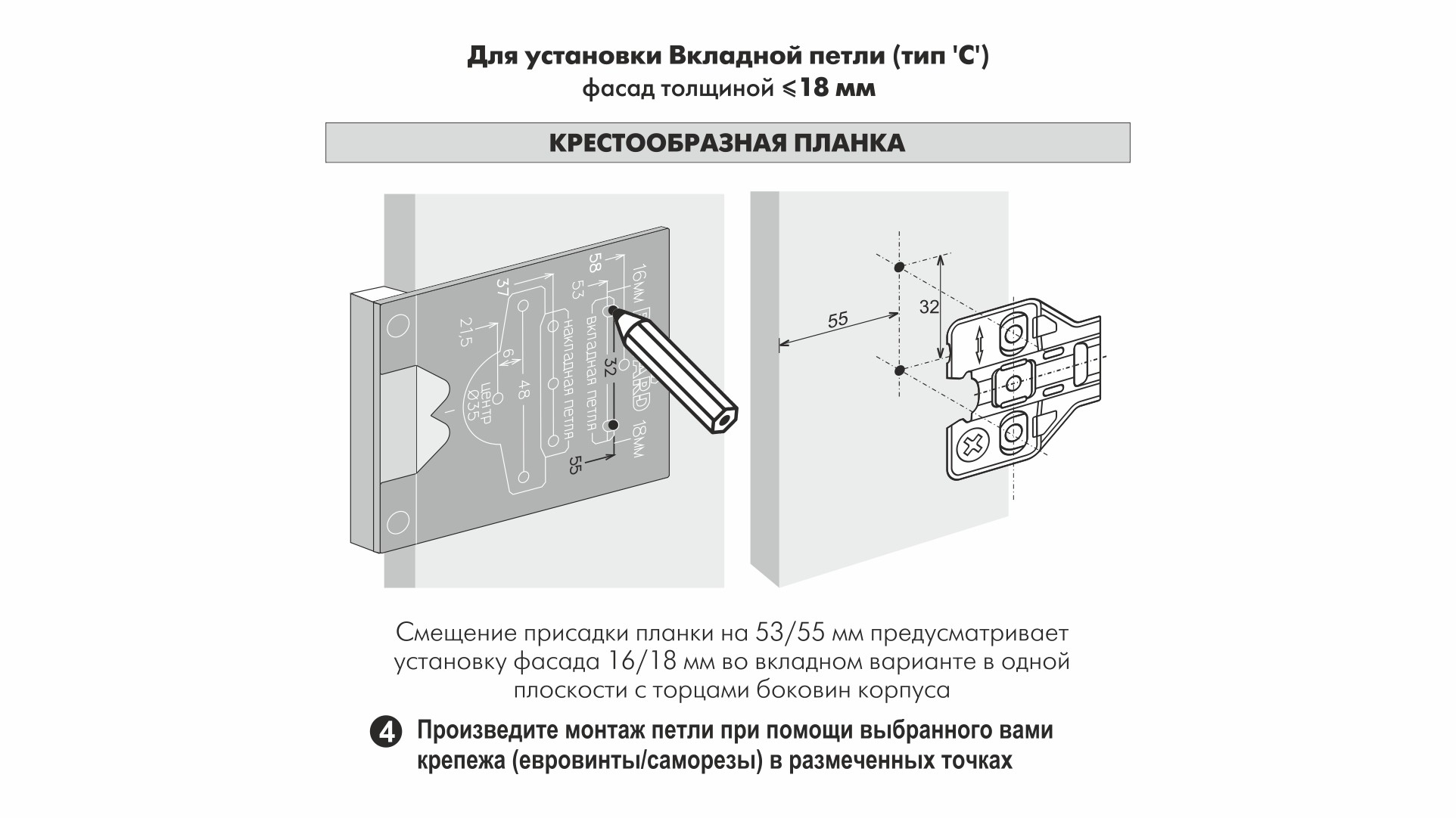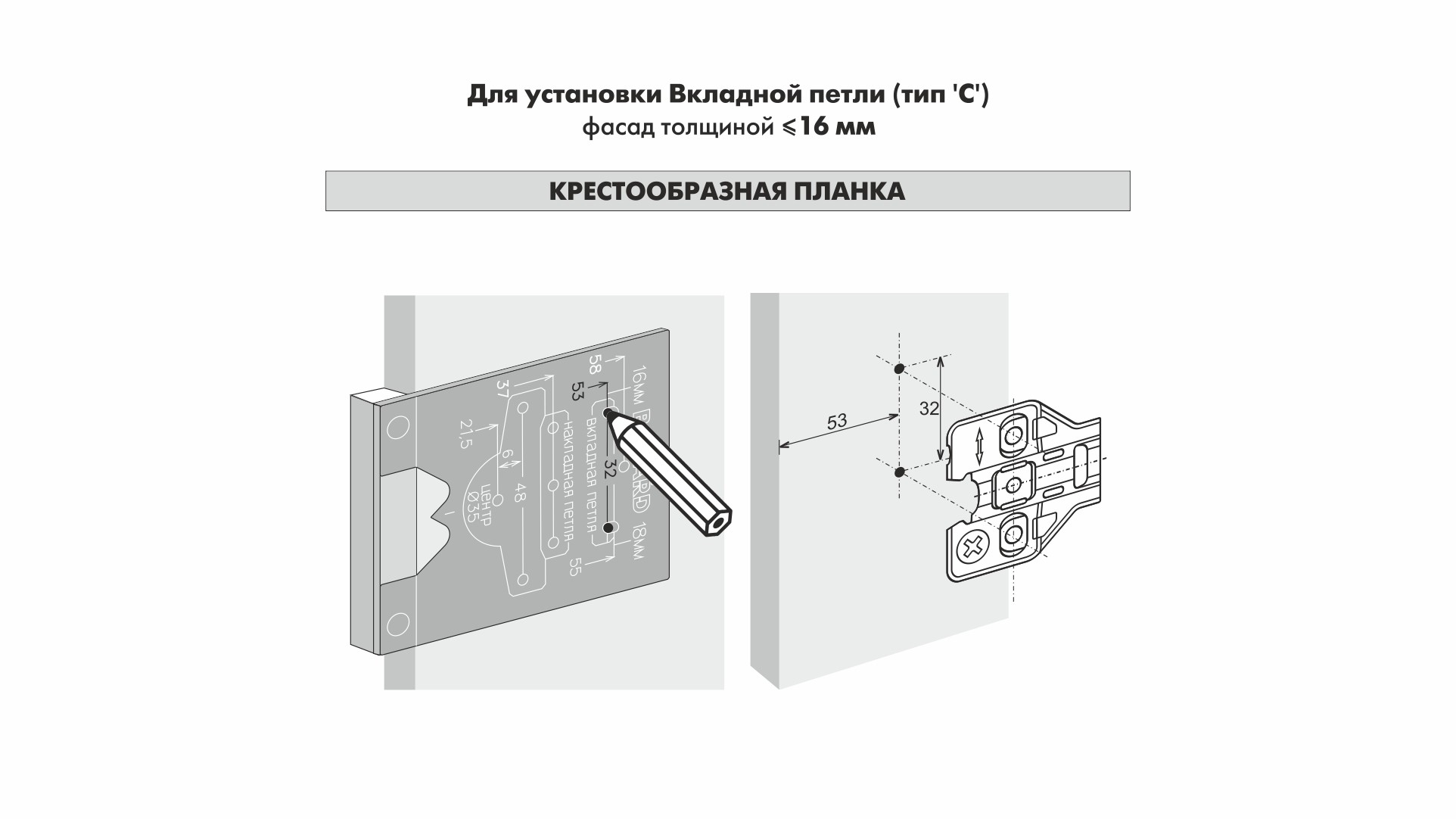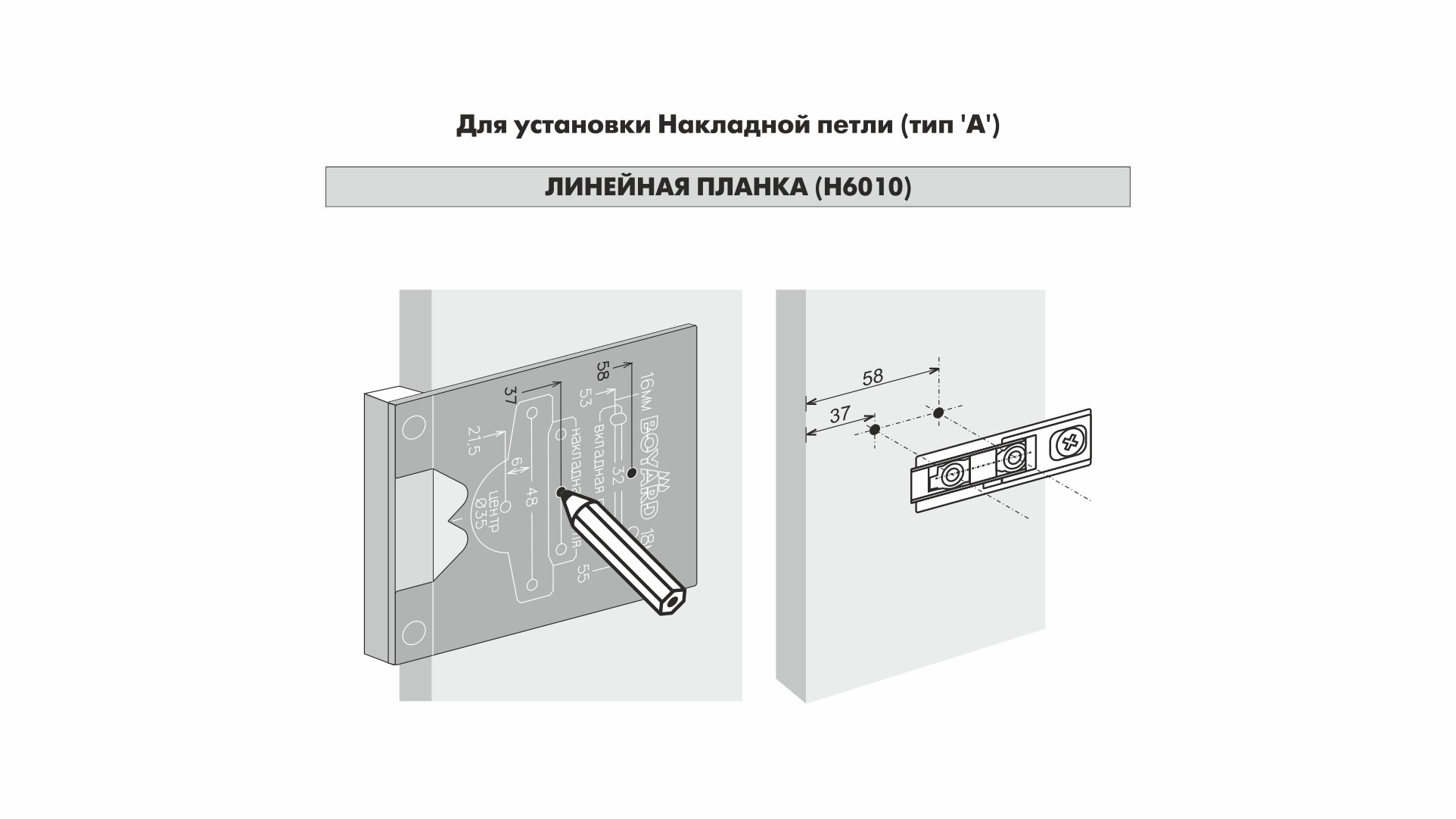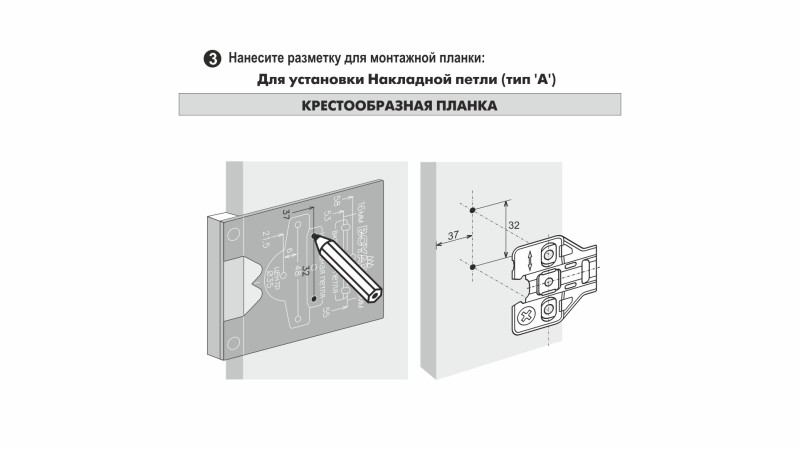 S907 — разметочный шаблон для петель с расстоянием до центра сверления под чашку K=4. Позволяет выполнять точную разметку отверстий для установки фурнитуры, что значительно упрощает последующий монтаж. Может использоваться как в индивидуальном, так и в серийном производстве мебели.