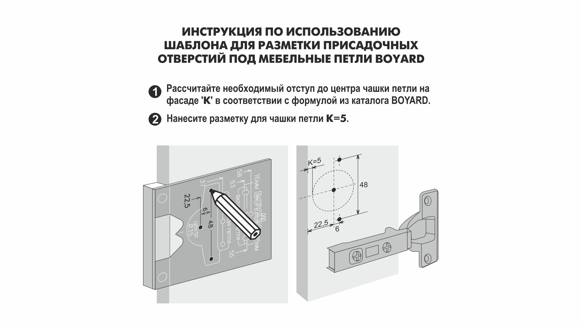 S908 — разметочный шаблон для петель с расстоянием до центра сверления под чашку K=5. Позволяет выполнять точную разметку отверстий для установки фурнитуры, что значительно упрощает последующий монтаж. Может использоваться как в индивидуальном, так и в серийном производстве мебели.