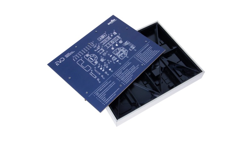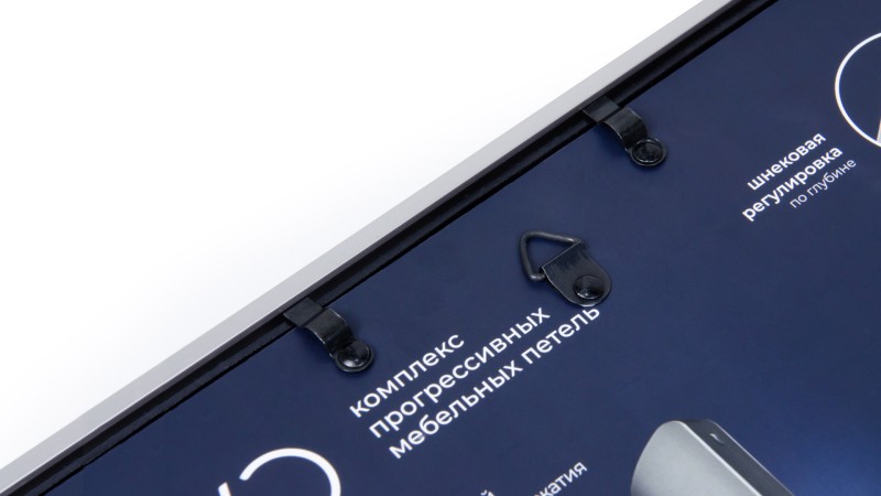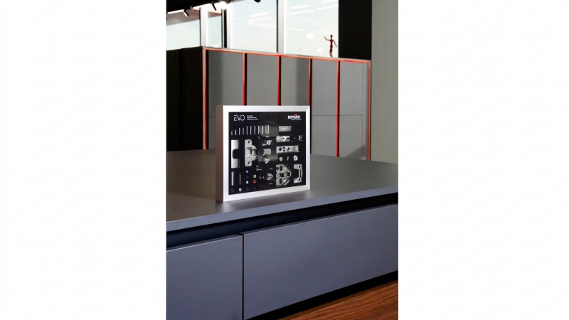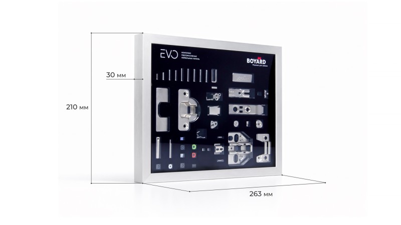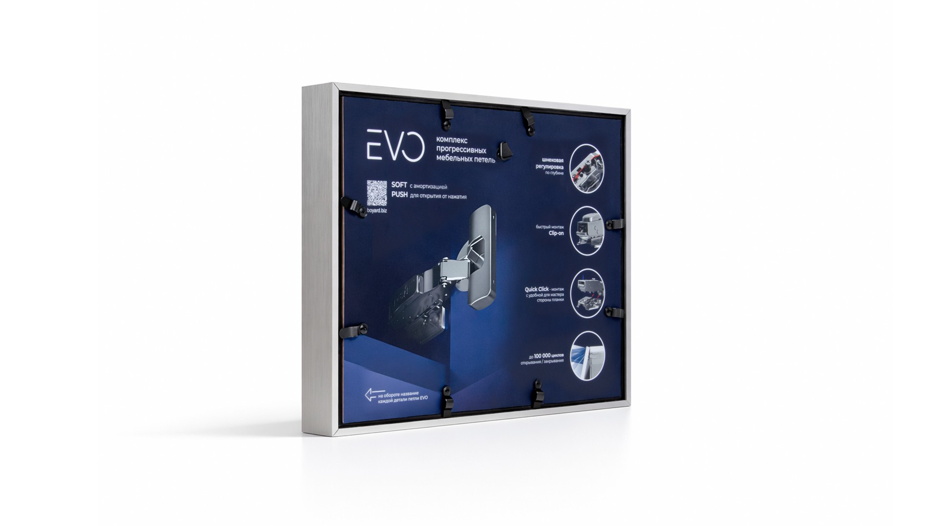 В стильной минималистичной рамке под защитным оргстеклом с логотипом ЭVO представлена флагманская петля линейки прогрессивных мебельных петель ЭVO - СИСТЕМА H801 – в разобранном виде, в комплекте с аксессуарами. Данный формат демонстрации продукта позволяет изучить сложную структуру петли и своими глазами убедиться в высоком качестве исполнения всех составляющих её деталей. На оборотной стороне рамы размещена техническая схема с наименованием всех элементов петли – информация, которая необходима новичкам и профессионалам при изучении строения современных мебельных петель ЭVO.