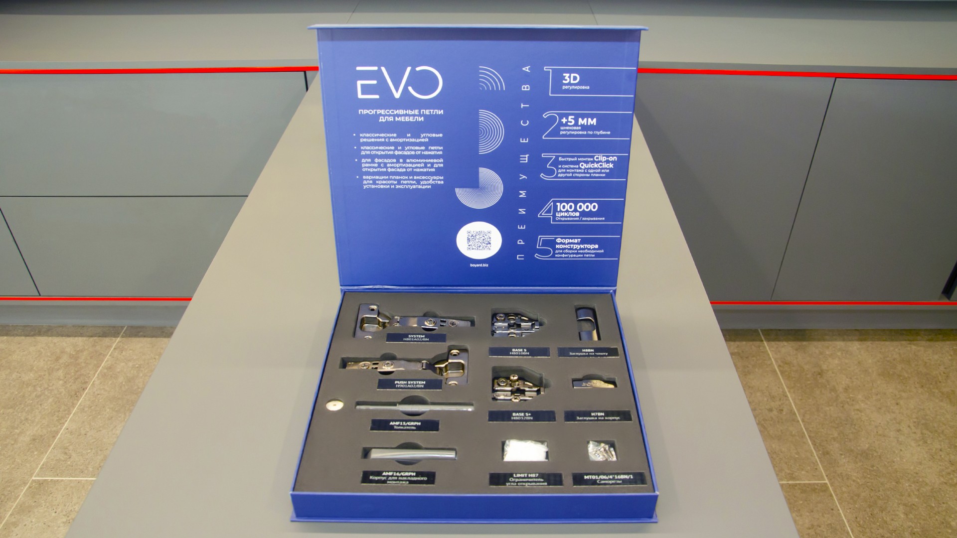 Стильный демо-бокс наглядно демонстрирует высокий уровень исполнения петель и поясняет принцип прогрессивного комплекса EVO: производитель сам выбирает составляющие для своей петли EVO.