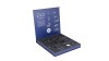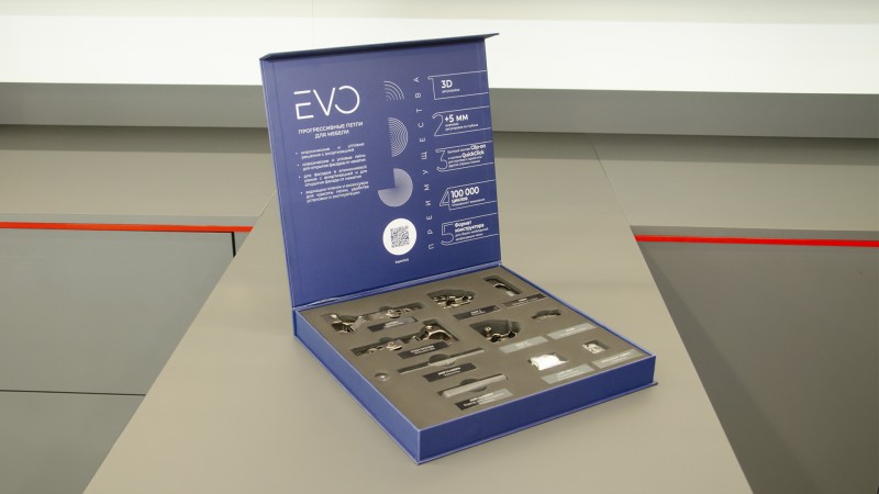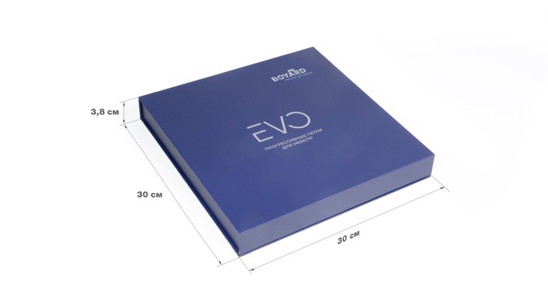 Демонстрационный бокс EVO выполнен в виде стильной брендированной коробки с крышкой-клапаном, информация на внутренней стороне крышки посвящена комплексу прогрессивных мебельных петель EVO.