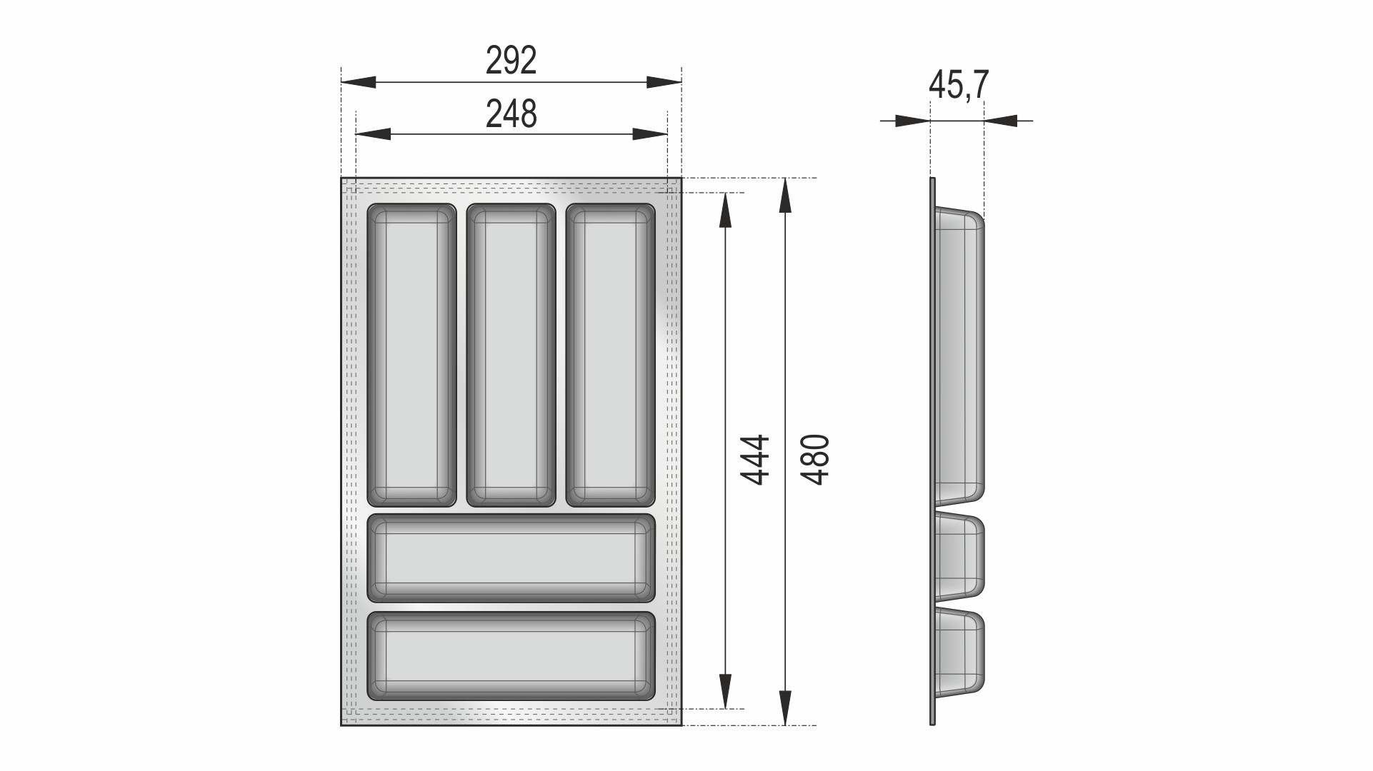 PC14 — многосекционный поддон из экологичного полипропилена, необходим для хранения столовых приборов. Является обязательным образующим элементом для формирования любой комбинации поддонов линейки BLӦKI для выдвижных мебельных ящиков глубиной 500 мм и шириной от 500 мм.