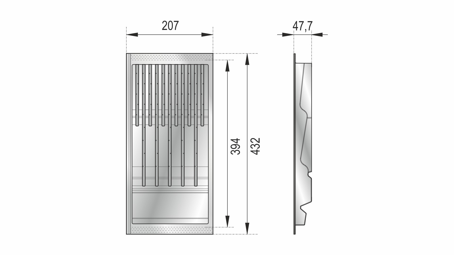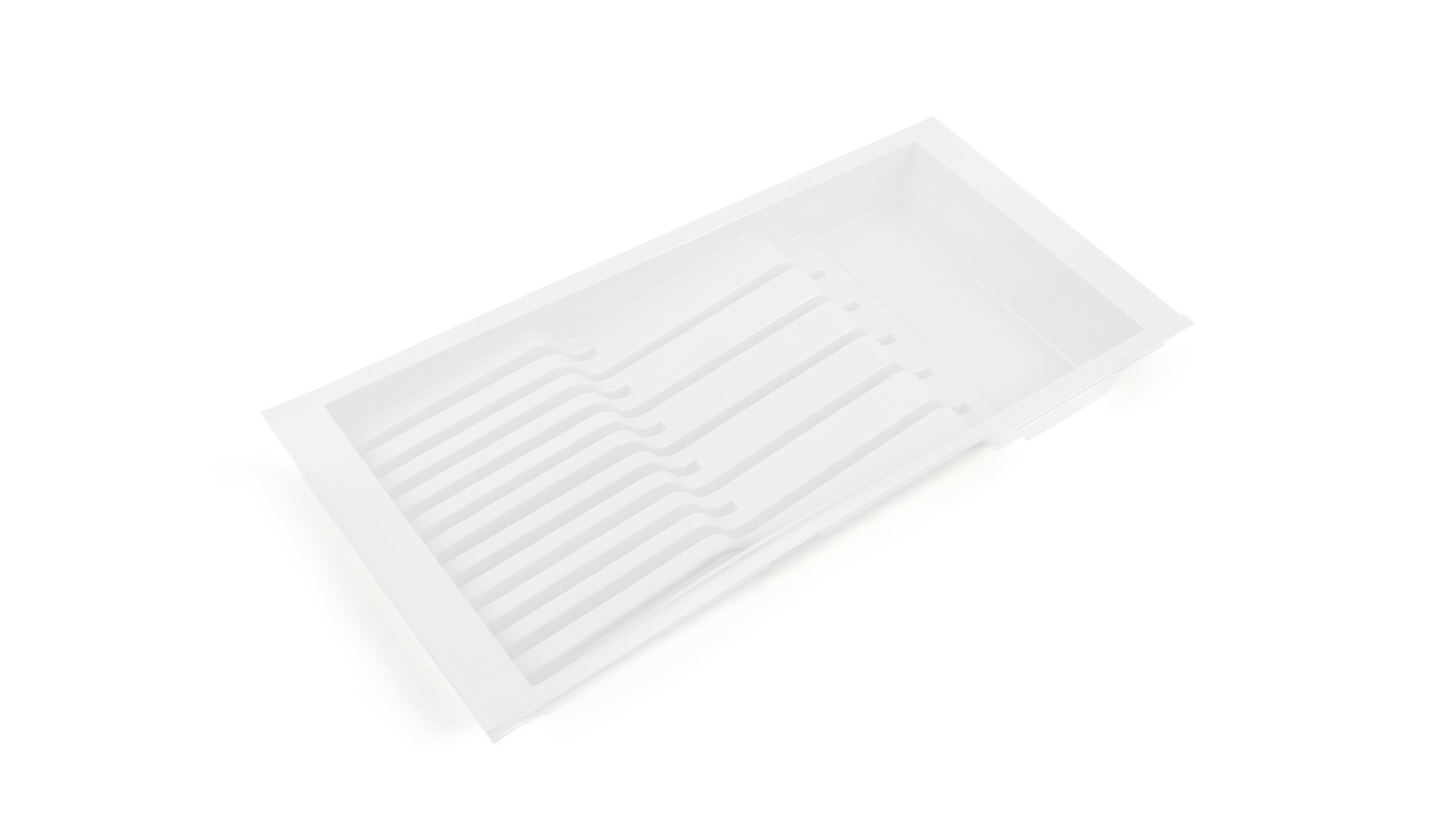 PC15 — поддон из экологичного полипропилена, необходим для хранения ножей разных габаритов. Является составным элементом для формирования индивидуальной комбинации поддонов линейки БЛОКИ для выдвижных мебельных ящиков глубиной 450 мм и шириной от 700 мм.