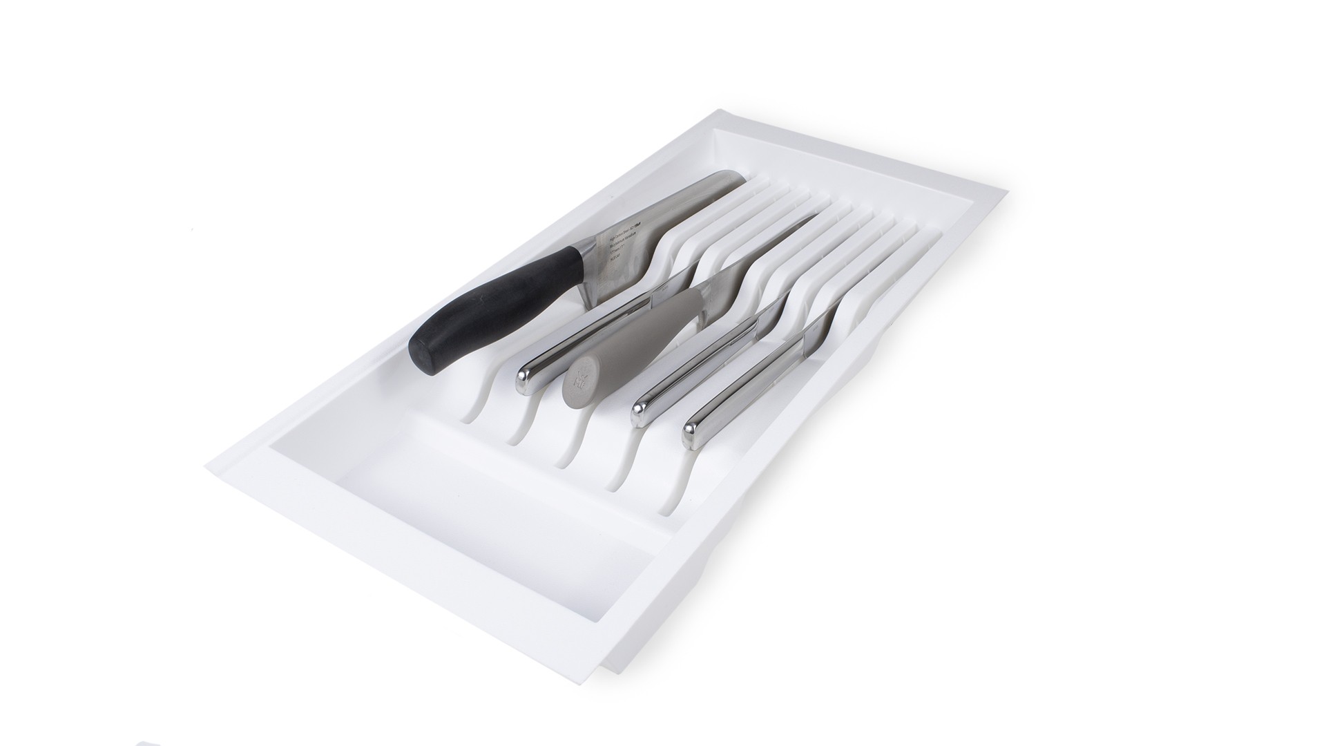 Эргономичная конструкция поддона рассчитана на размещение 5 больших и 6 маленьких ножей.