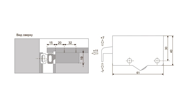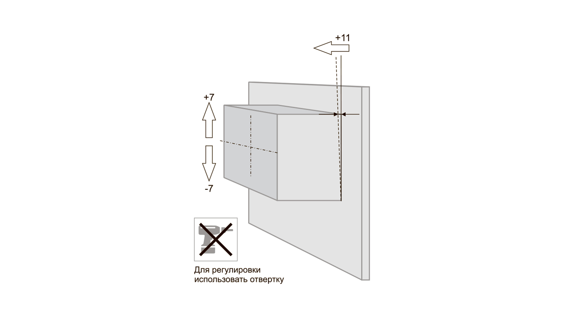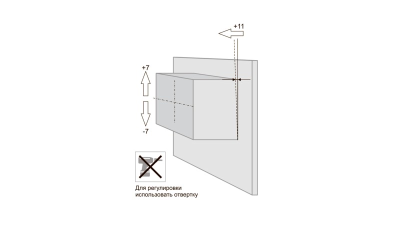 Модель позволяет отрегулировать смещение мебельного корпуса по вертикали +/- 7 мм, и по горизонтали от плоскости стены + 11 мм.