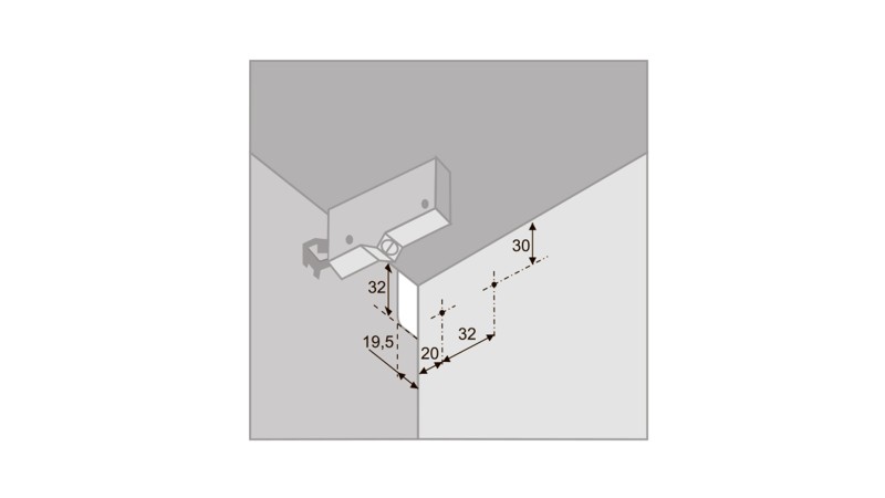 CH03 – навес для верхних баз мебели с нагрузкой на пару до 50 кг. Модель устанавливается на боковой стенке внутри мебельного изделия и фиксируется крючком на ответной планке, закреплённой к стене.