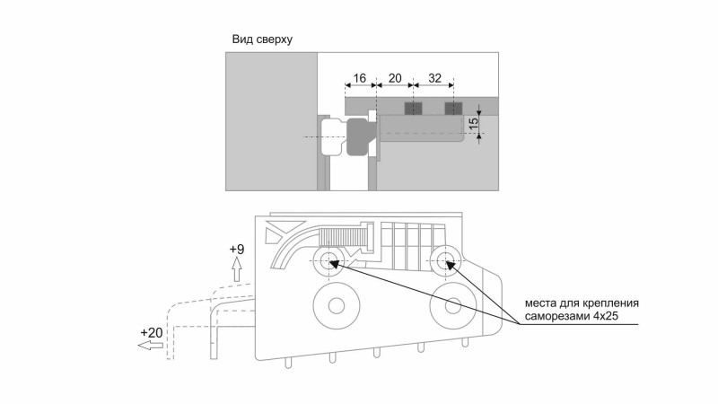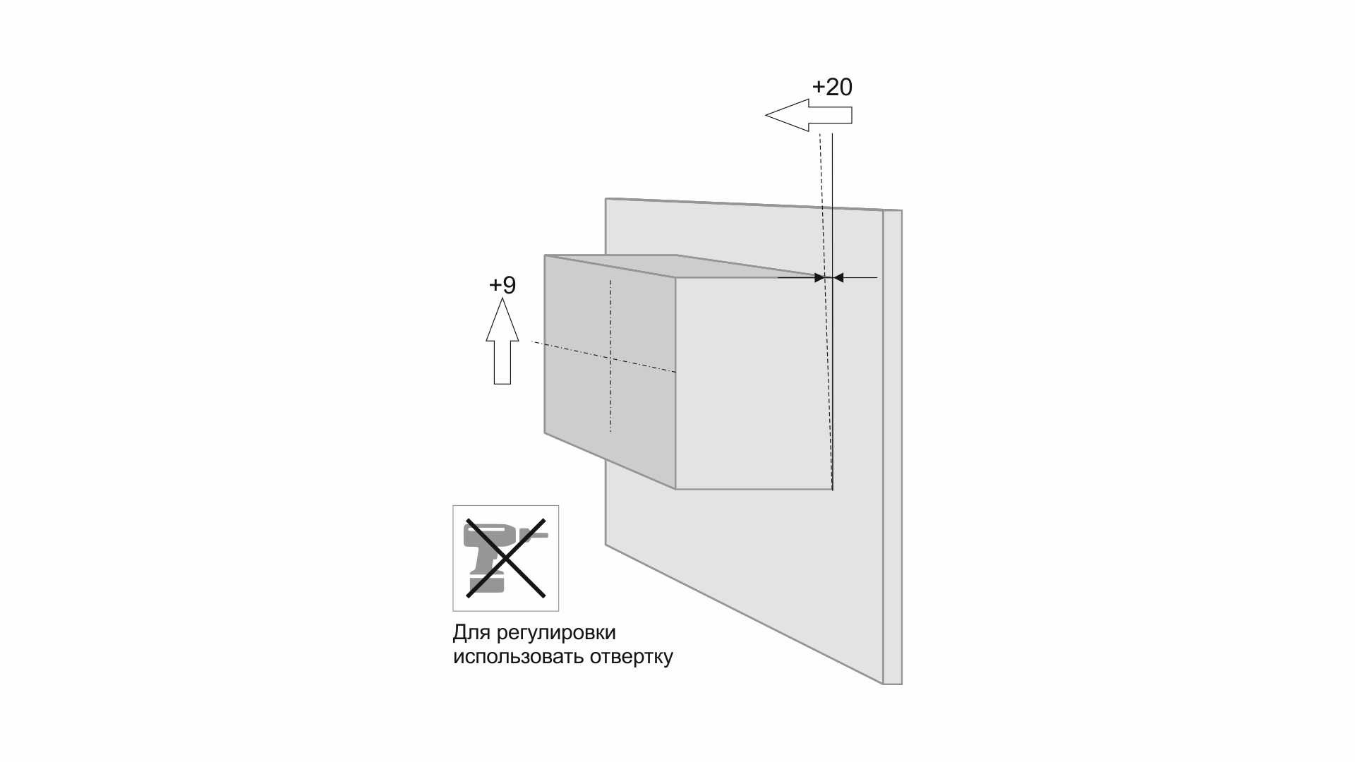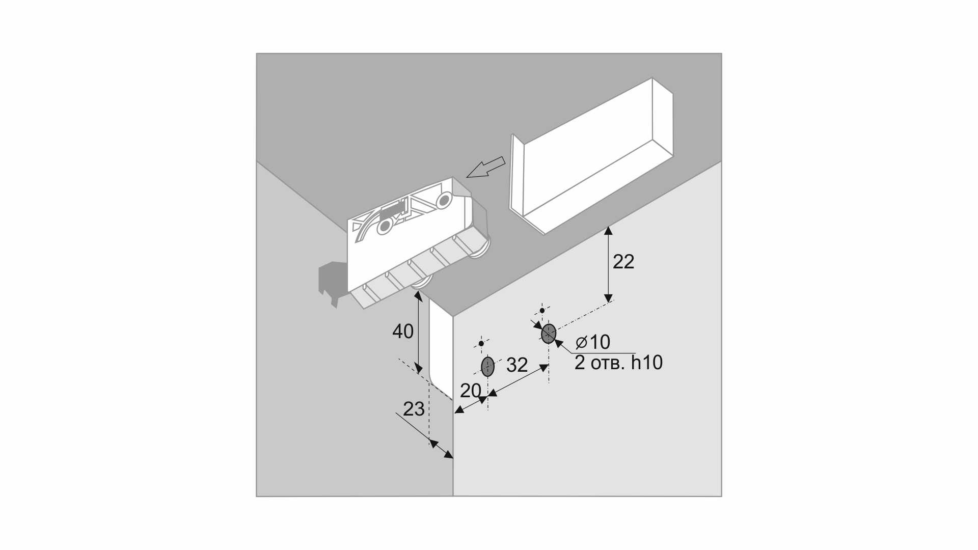 Модель устанавливается на боковых стенках внутри мебельного корпуса в заранее просверленные отверстия в плите. Футорки навеса (являющиеся частью его корпуса) легко соединяются с проделанными отверстиями и затягиваются с помощью саморезов, надёжно фиксируя CH07 на плоскости в четырёх точках, что обеспечивает высокую надёжность крепления. При помощи болтов на корпусе навеса, производится регулировка расстояния от короба до стены + 20 мм и положения по высоте + 9 мм.