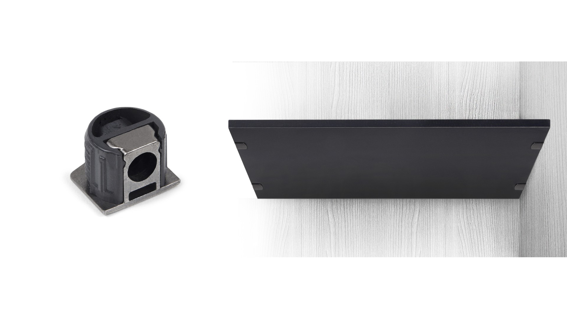Полкодержатель предназначен для монтажа полок толщиной от 16 мм в мебельные модули любого стиля и направления. Металлический фланец полностью скрывает пластиковые элементы полкодержателя, оставляя на виду лишь лаконичную часть детали.