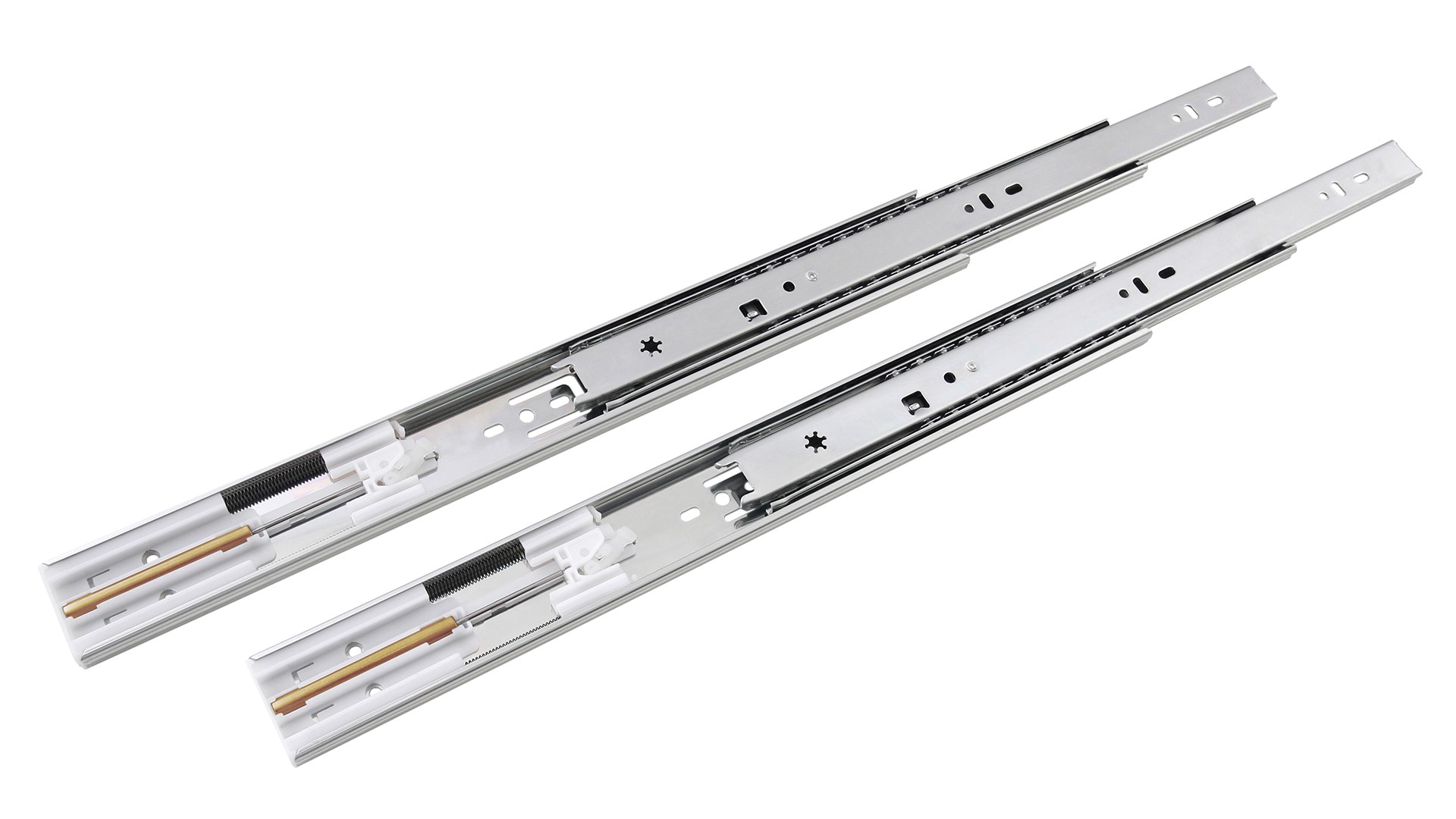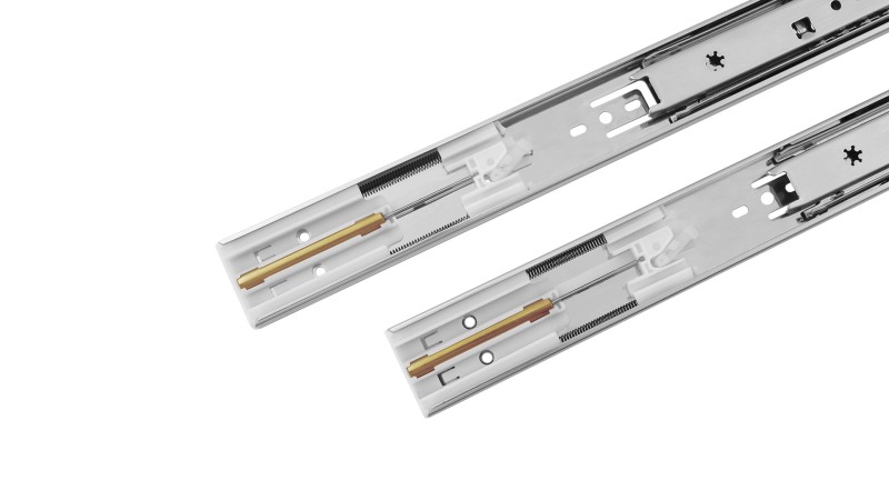 DB4512 – базовые шариковые направляющие с усовершенствованной амортизацией, изготовленные в соответствии с европейским стандартом. Конфигурация доводчика базируется на двухпружинном механизме с медным амортизатором и опцией самопостановки. Благодаря этому доводчики работают стабильно, мягко и бесшумно. Модель надежна и долговечна – она обладает оптимальной грузоподъемностью до 30кг (зависит от монтажной длины) и гарантирует бесперебойную работу механизма на протяжении 40 000 циклов открывания/закрывания.