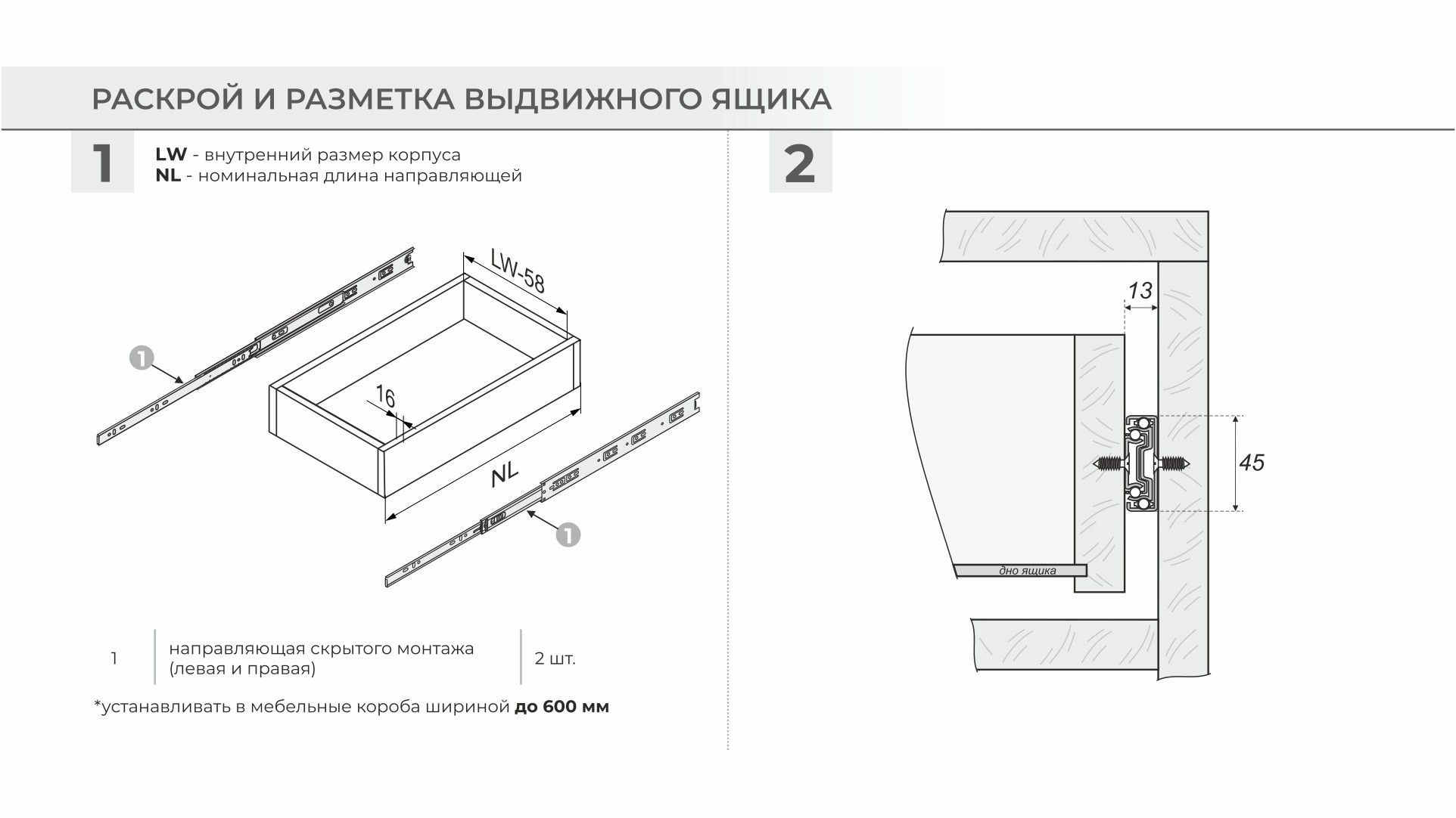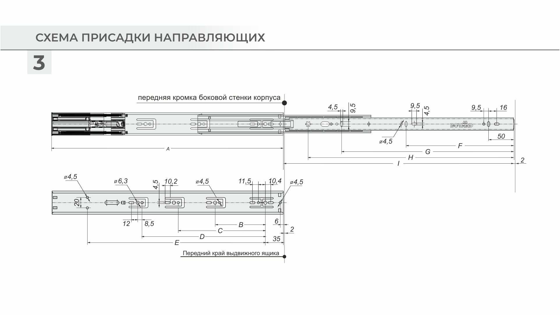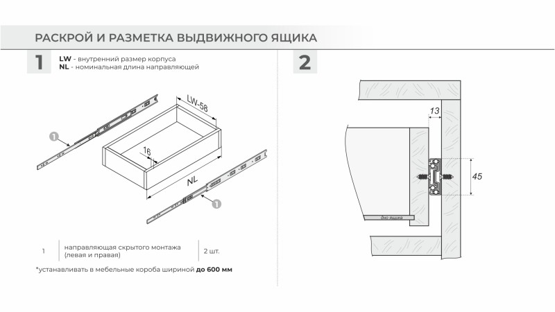 Ширина направляющих составляет ровно 13 мм, а значит раскрой дна для мебельного ящика максимально удобен и прост. Для более надёжного соединения направляющей к боковине мебельного ящика у DB4525 имеется специальное технологичное отверстие в форме звёздочки, «лепестки» которой при вкручивании самореза в отверстие отгибаются и врезаются в боковину мебельного ящика. Саморез при этом не повреждает корпус доводчика и обеспечивает плотное прилегание части направляющей к боковой стенке мебельного ящика, не нарушая его целостности.
