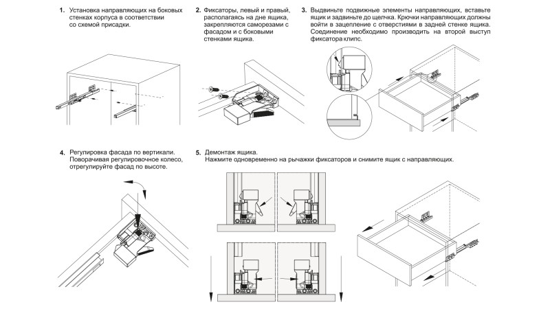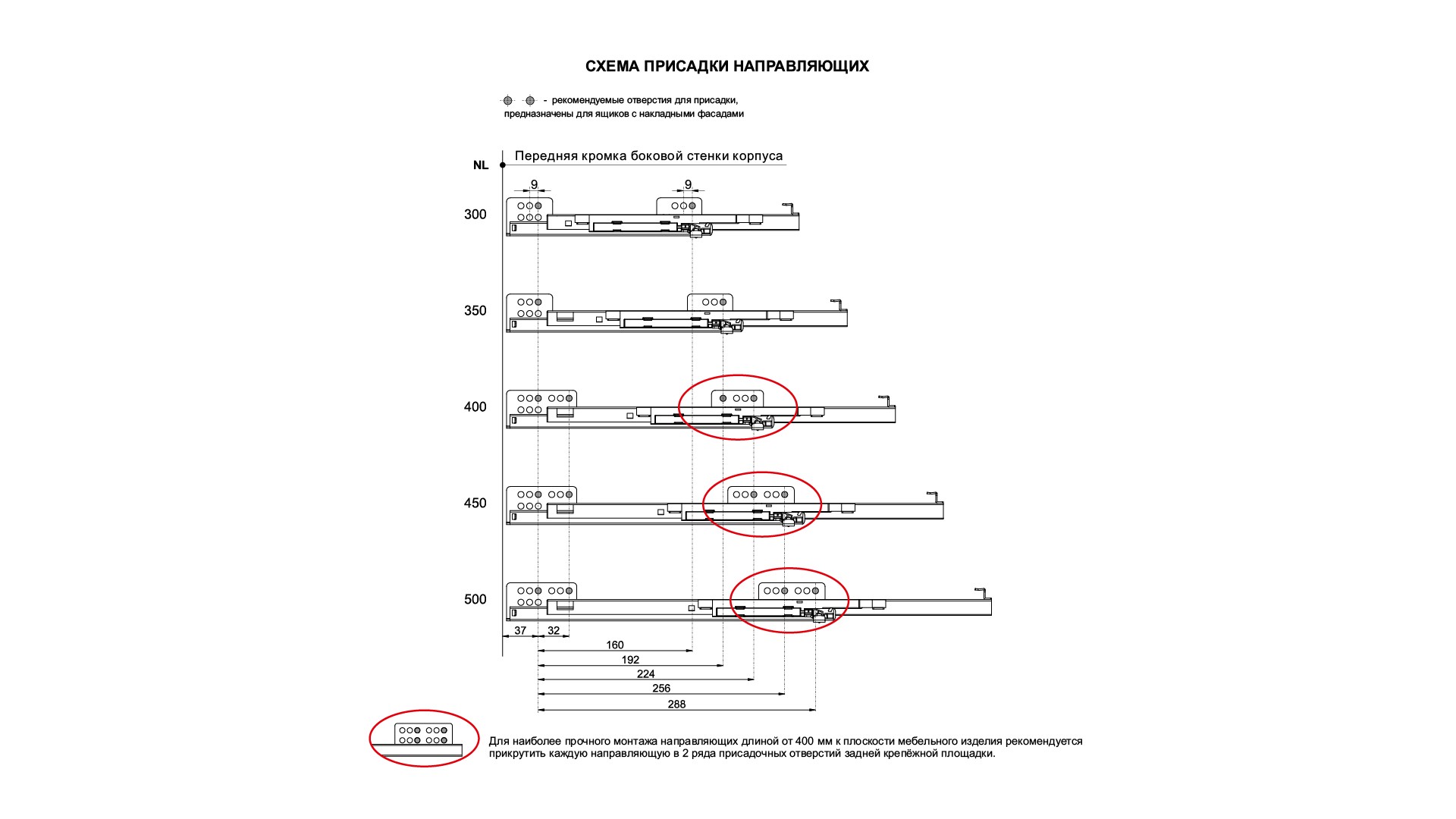 Для наиболее прочного монтажа направляющих длиной от 400 мм к плоскости мебельного изделия рекомендуется прикрутить каждую направляющую в 2 ряда присадочных отверстий задней крепёжной площадки.