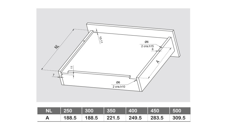 Для наиболее прочного монтажа направляющих длиной от 400 мм к плоскости мебельного изделия рекомендуется прикрутить каждую направляющую в 2 ряда присадочных отверстий задней крепёжной площадки.