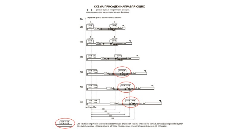 Для наиболее прочного монтажа направляющих длиной от 400 мм к плоскости мебельного изделия рекомендуется прикрутить каждую направляющую в 2 ряда присадочных отверстий задней крепёжной площадки.