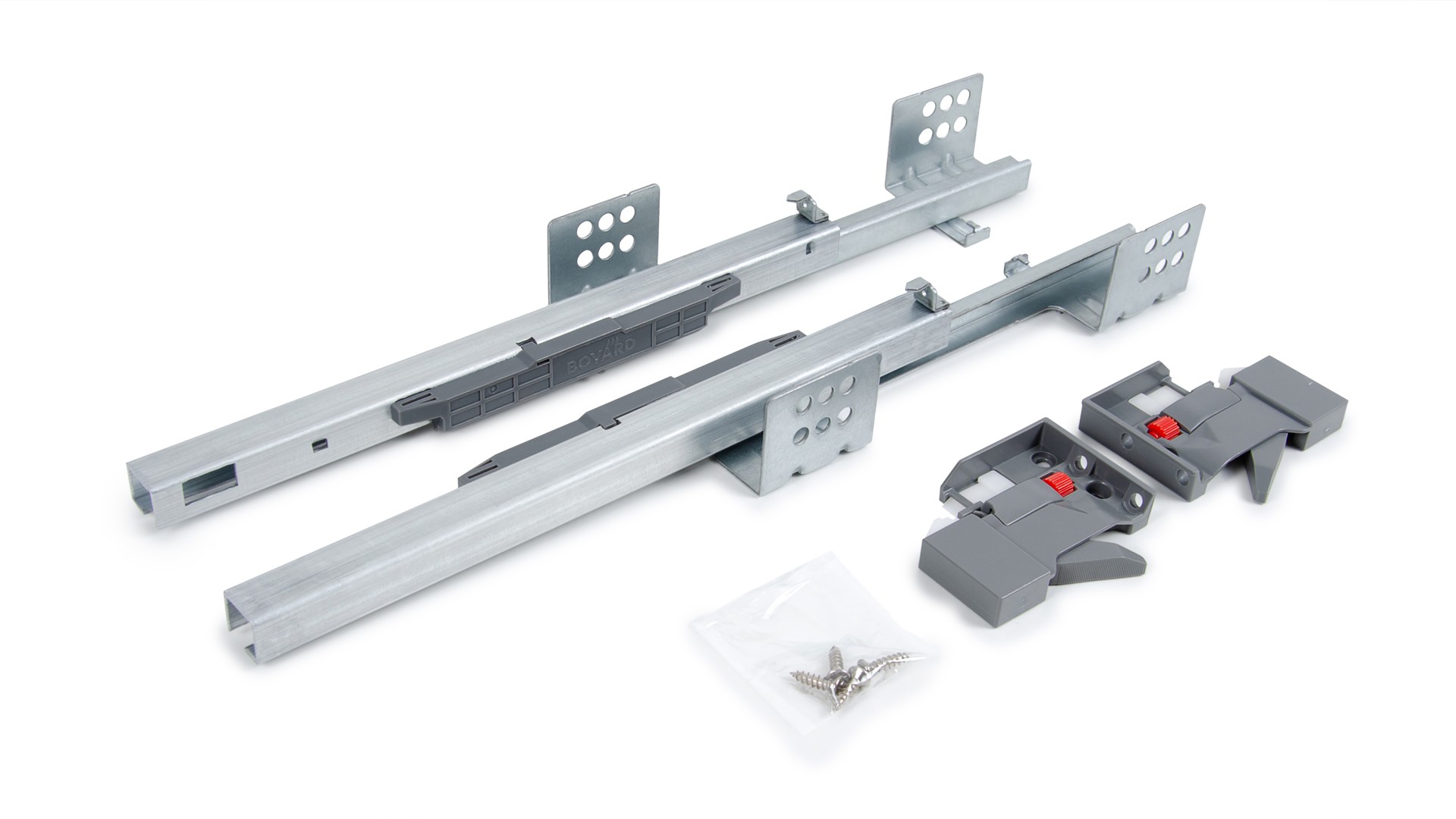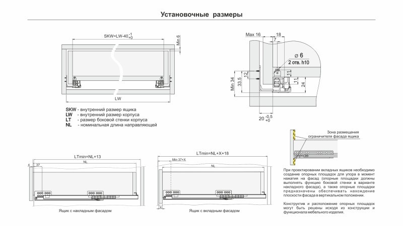 В направляющих предусмотрены дополнительные металлические упоры на подвижной и неподвижной частях направляющих для сдерживания давления в момент установки и в процессе эксплуатации. Это снижает риски излома механизма ПУШ, а также избавляет от необходимости создания дополнительных упоров при создании выдвижных ящиков с вкладным типом фасадов.